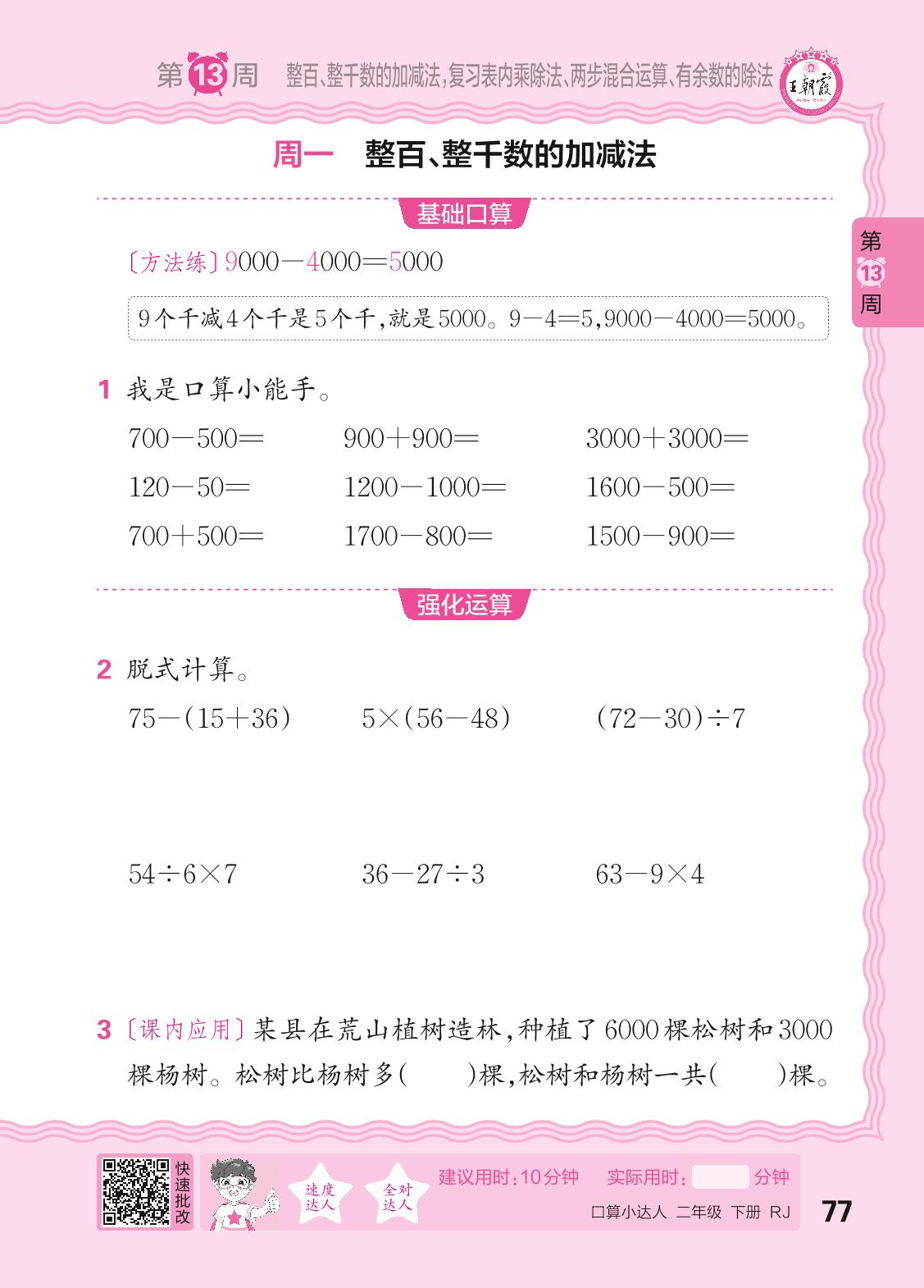 2024春下册二年级数学人教版 口算计算专练 第13周