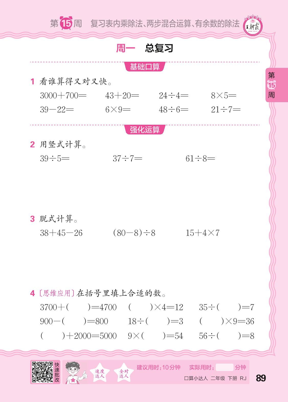 2024春下册二年级数学人教版 口算计算专练 第15周