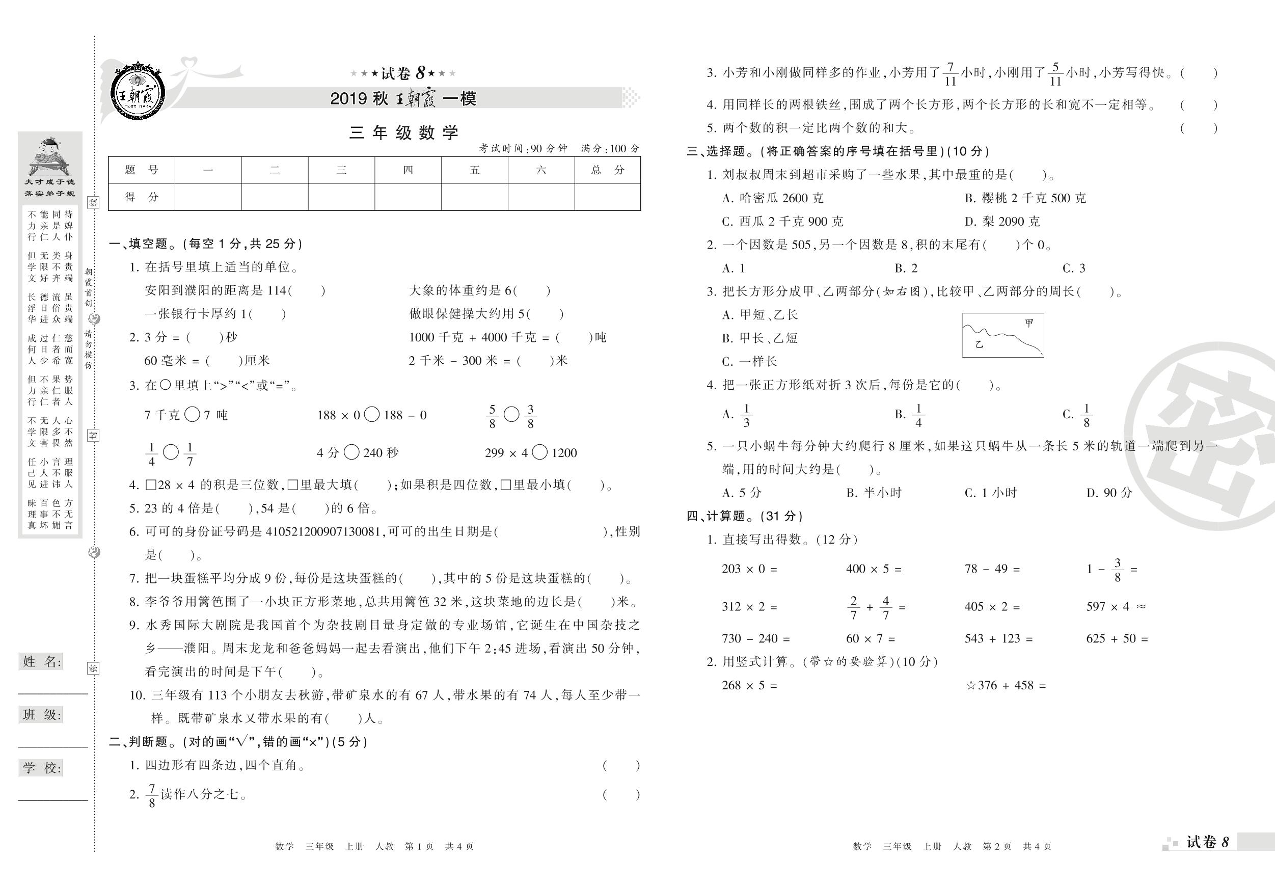 王朝霞期末模拟卷三年级上册数学(人教版)_R21080495428【8】