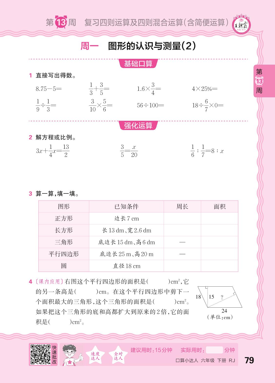 2024春下册六年级数学人教版 口算计算专练 第13周