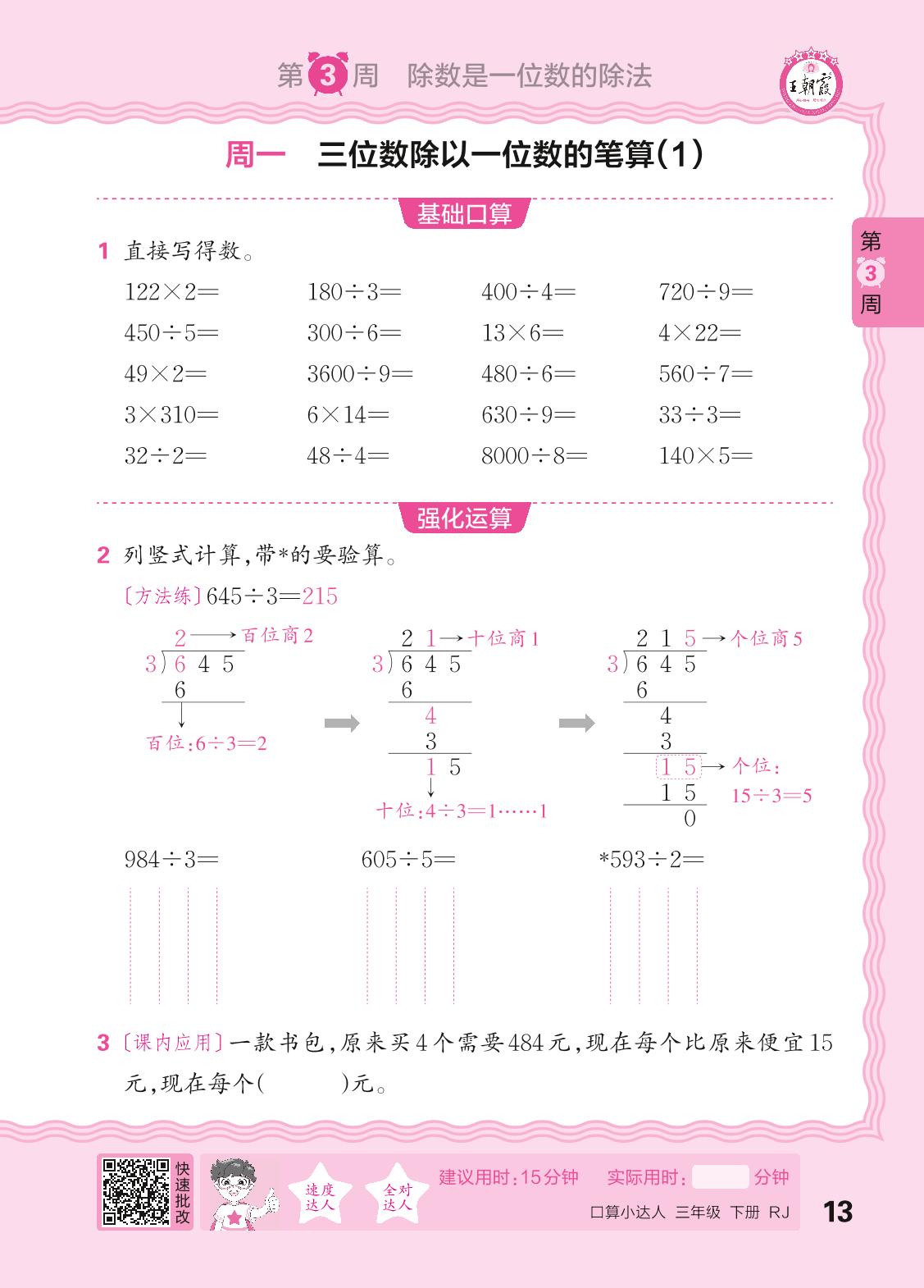 2024春下册三年级数学人教版 口算计算专练 第3周