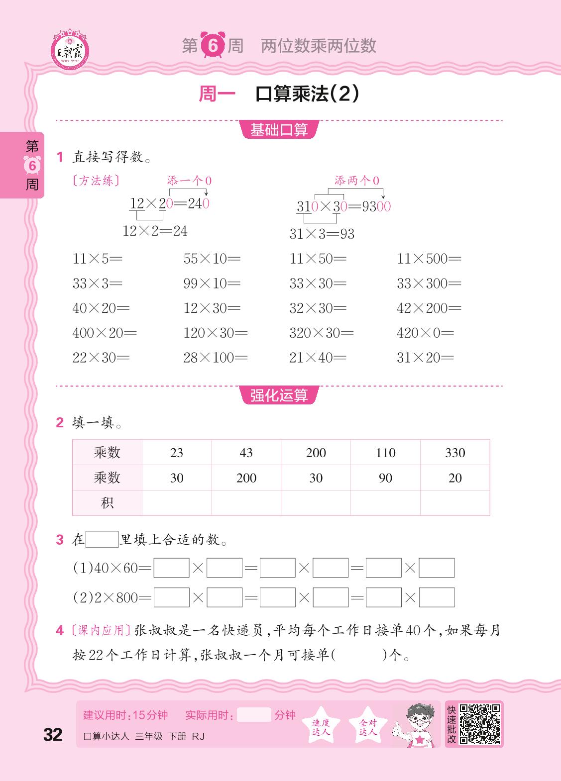 2024春下册三年级数学人教版 口算计算专练 第6周