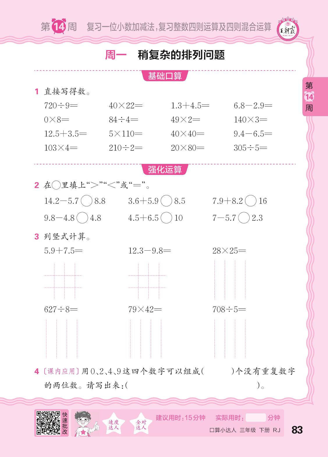 2024春下册三年级数学人教版 口算计算专练 第14周