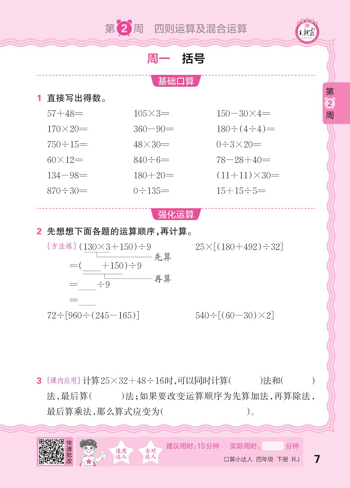 2024春下册四年级数学人教版 口算计算专练 第2周