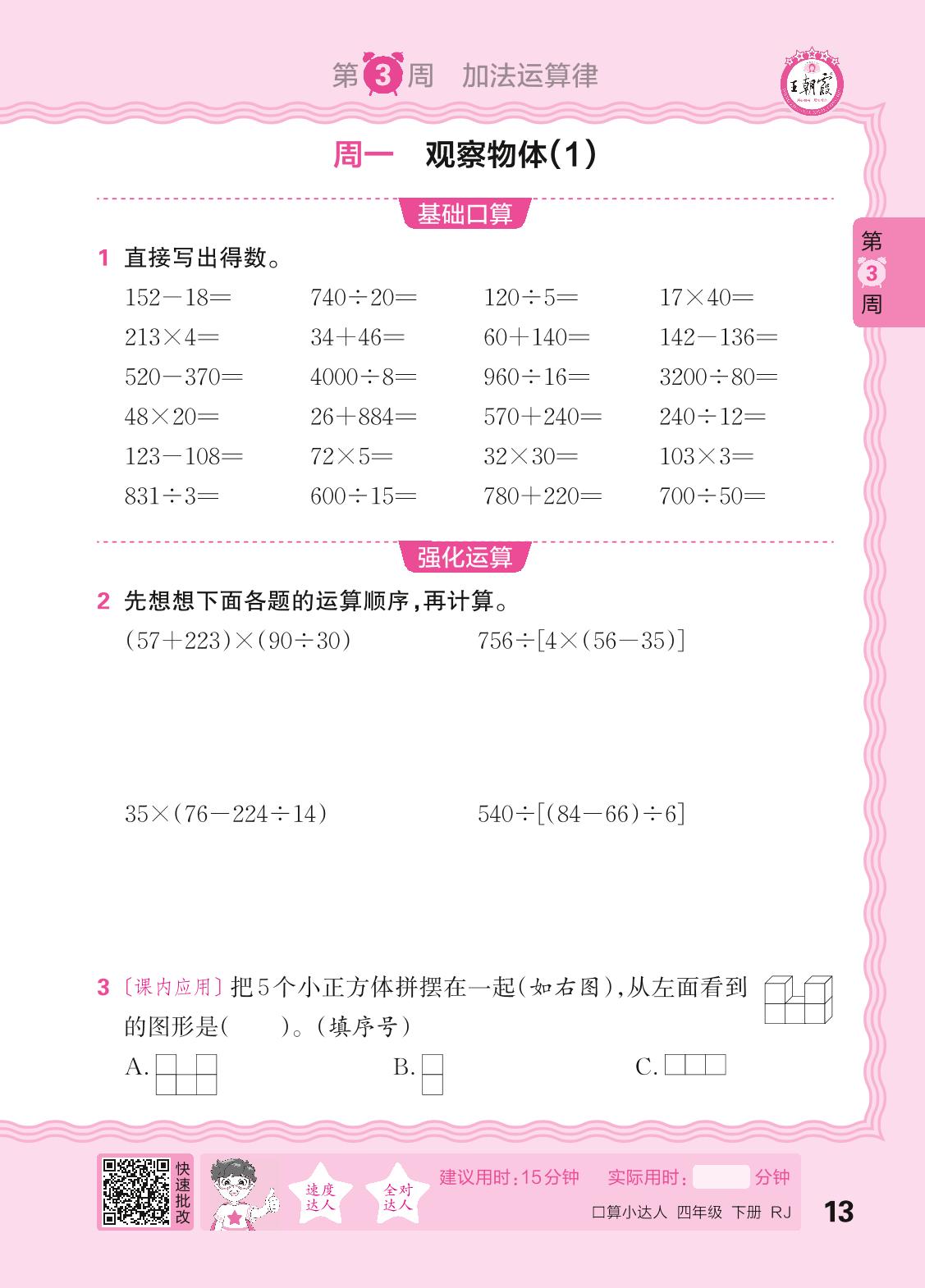 2024春下册四年级数学人教版 口算计算专练 第3周