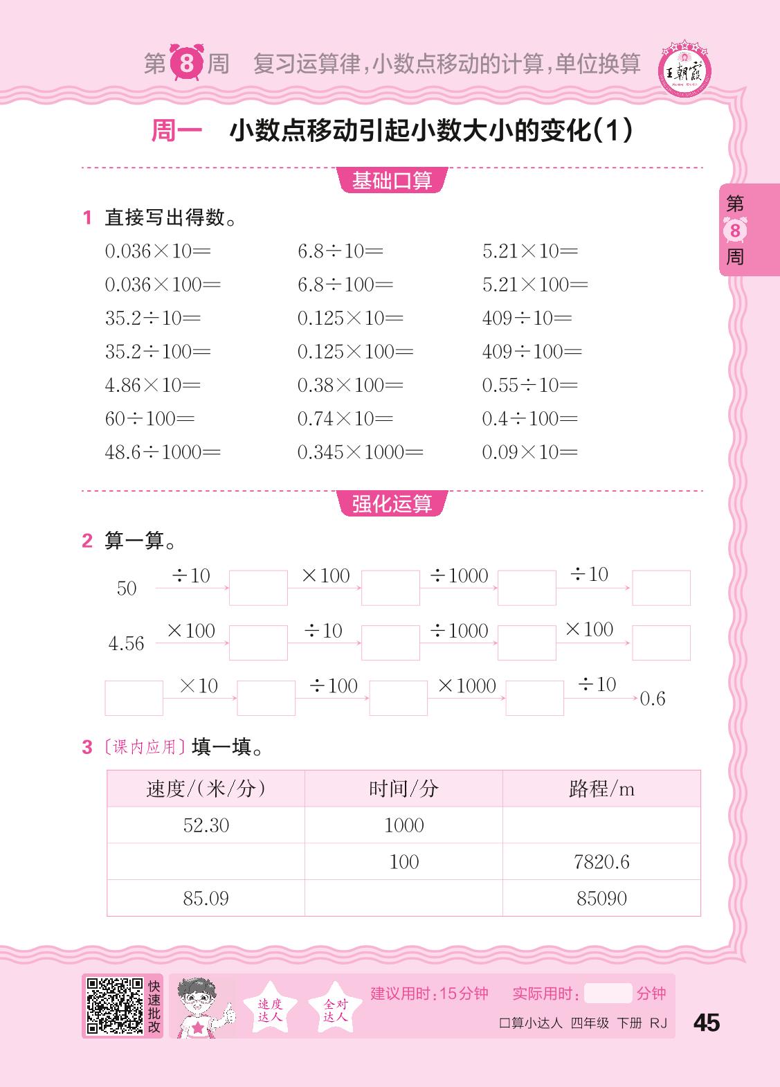 2024春下册四年级数学人教版 口算计算专练 第8周