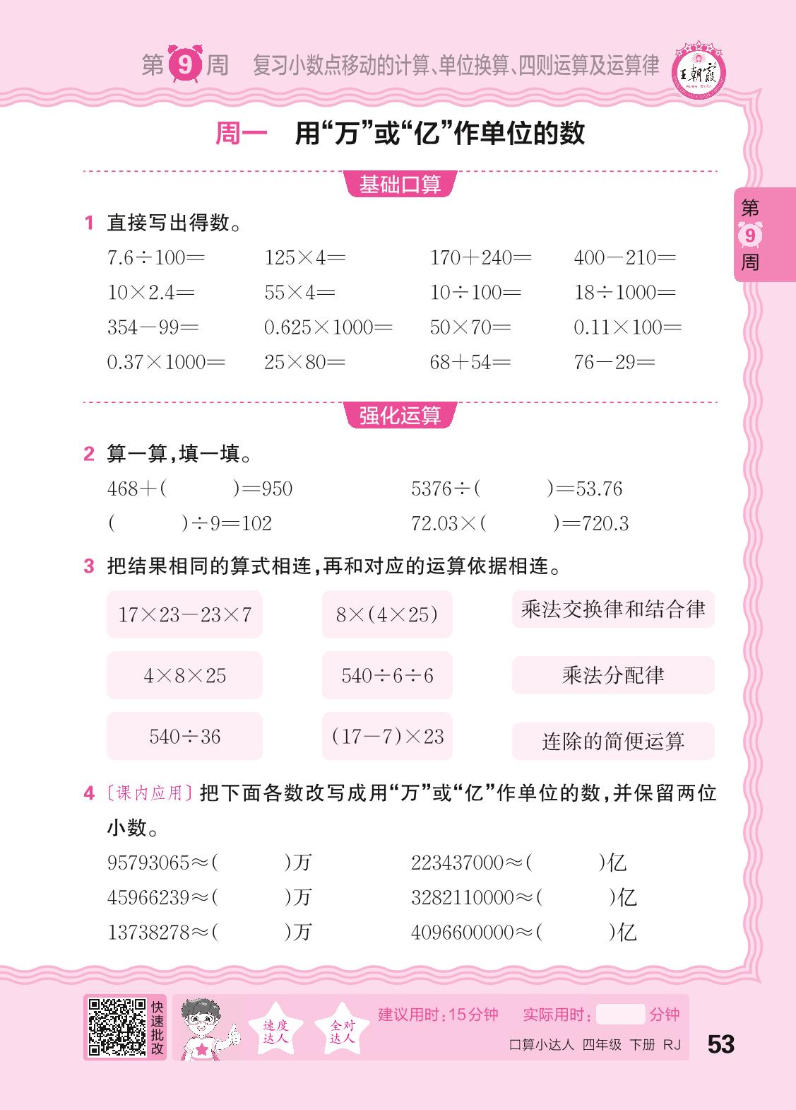 2024春下册四年级数学人教版 口算计算专练 第9周