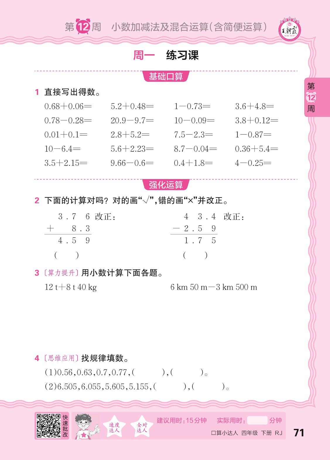 2024春下册四年级数学人教版 口算计算专练 第12周