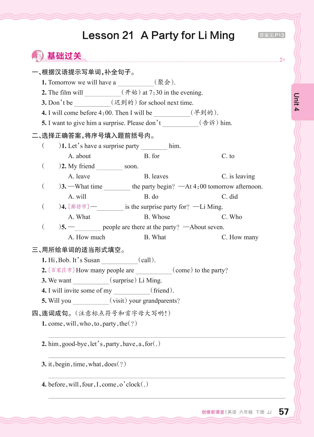 2024春下册六年级英语冀教版 Unit 4—Lesson 21 A Party for Li Ming