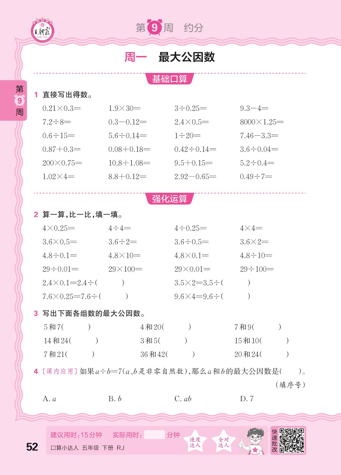 2024春下册五年级数学人教版 口算计算专练 第9周