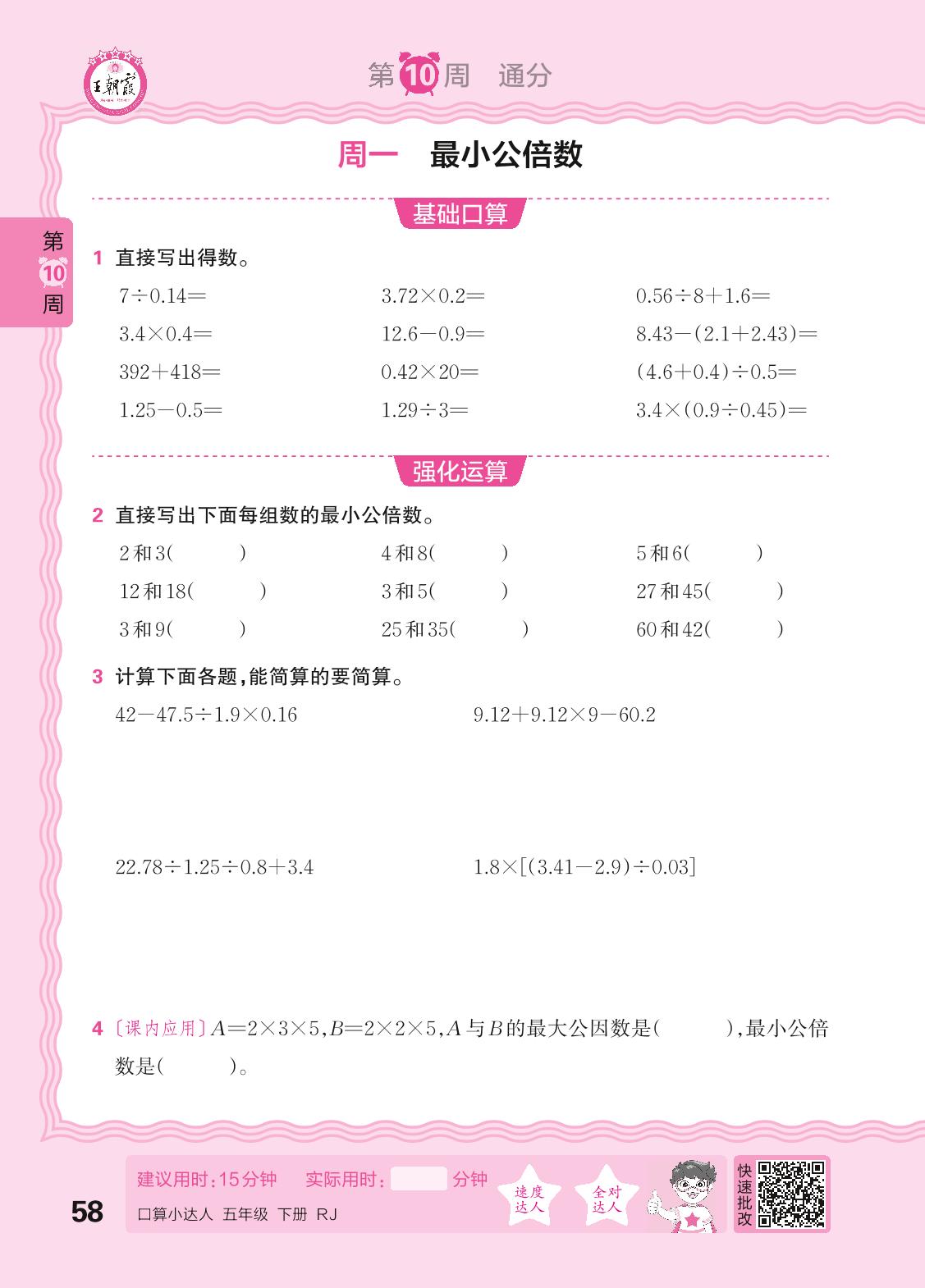 2024春下册五年级数学人教版 口算计算专练 第10周