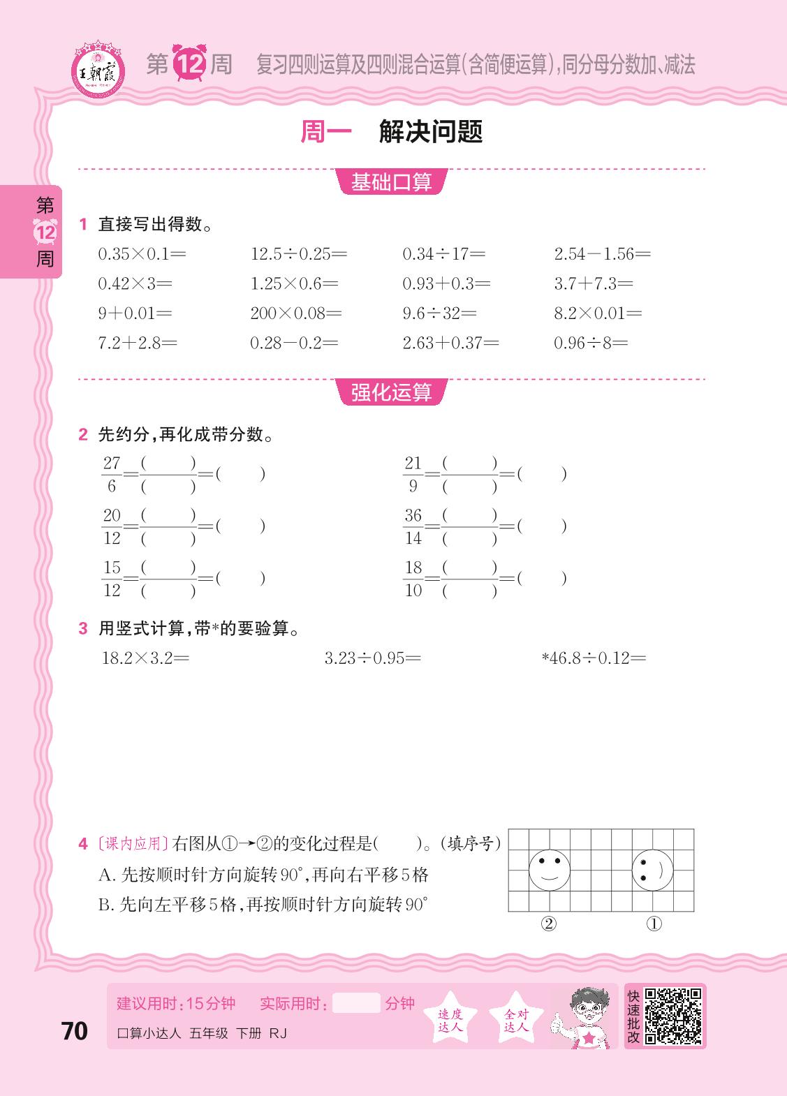 2024春下册五年级数学人教版 口算计算专练 第12周