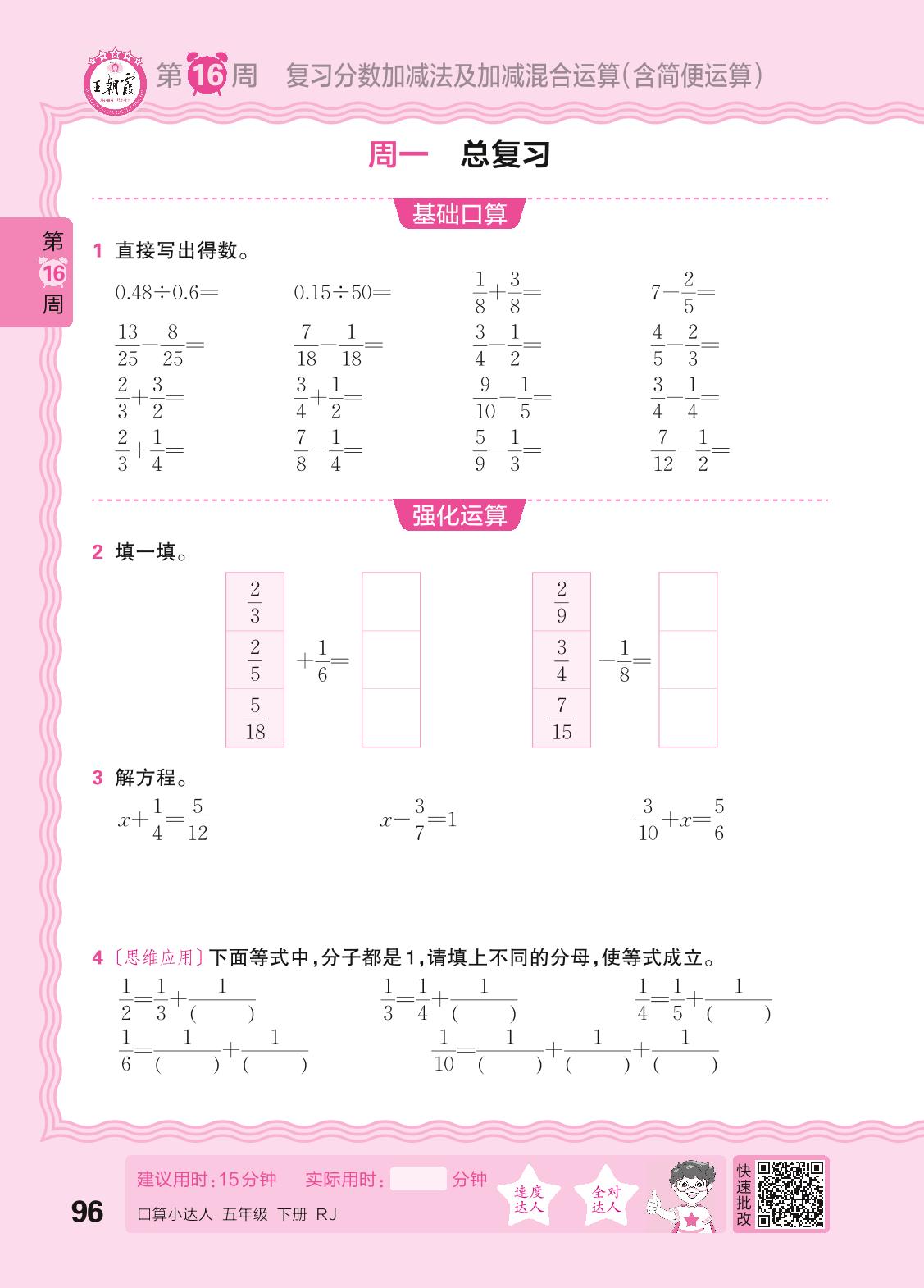 2024春下册五年级数学人教版 口算计算专练 第16周