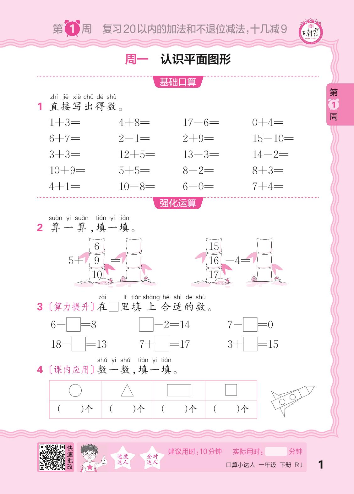 2024春下册一年级数学人教版 口算计算专练 第1周
