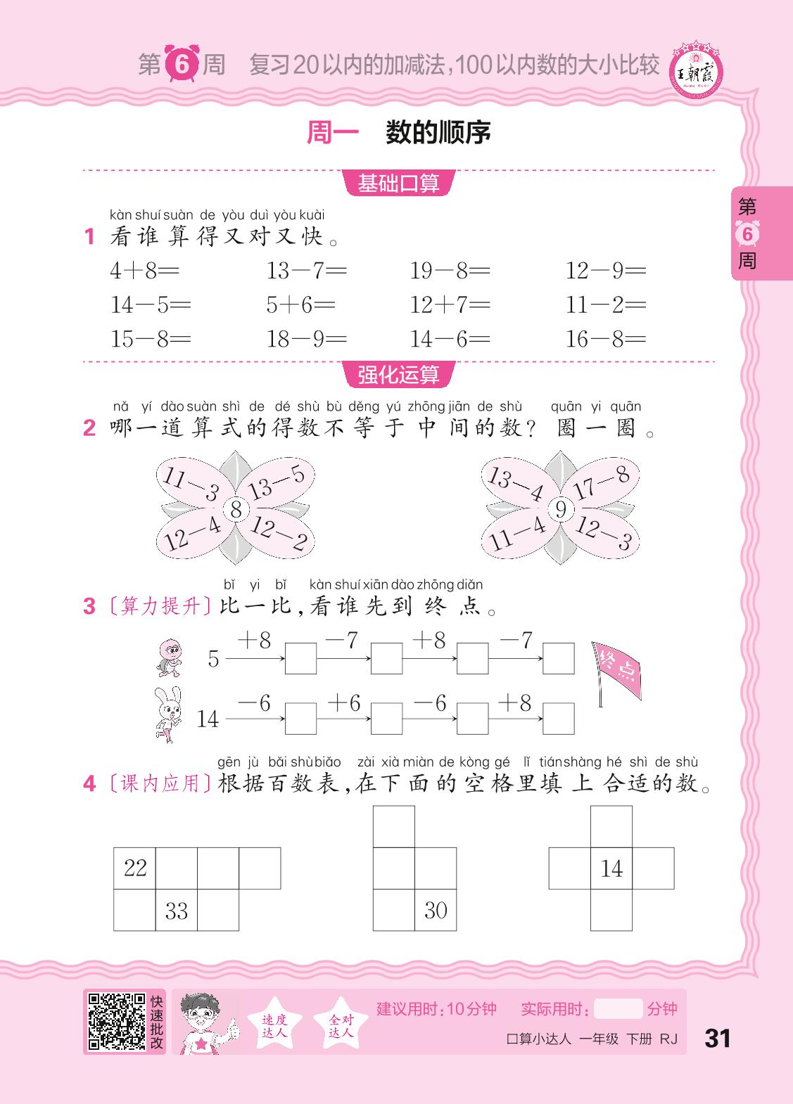 2024春下册一年级数学人教版 口算计算专练 第6周