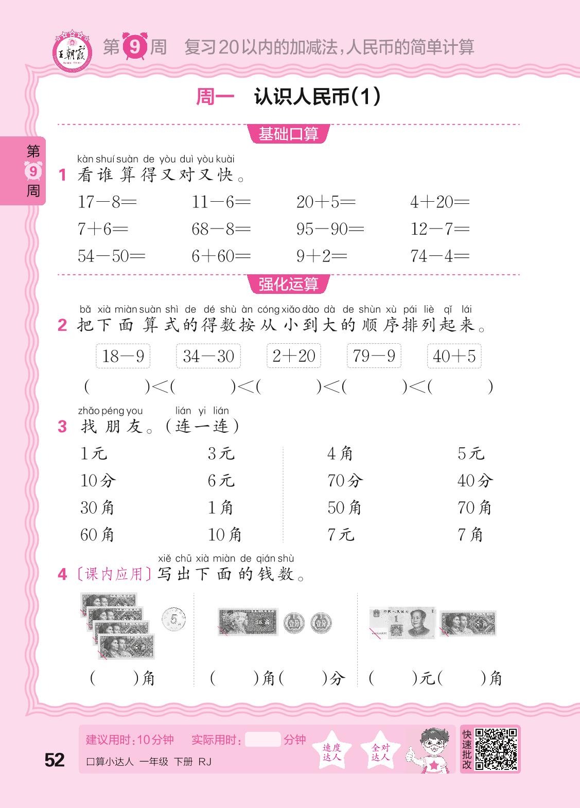 2024春下册一年级数学人教版 口算计算专练 第9周