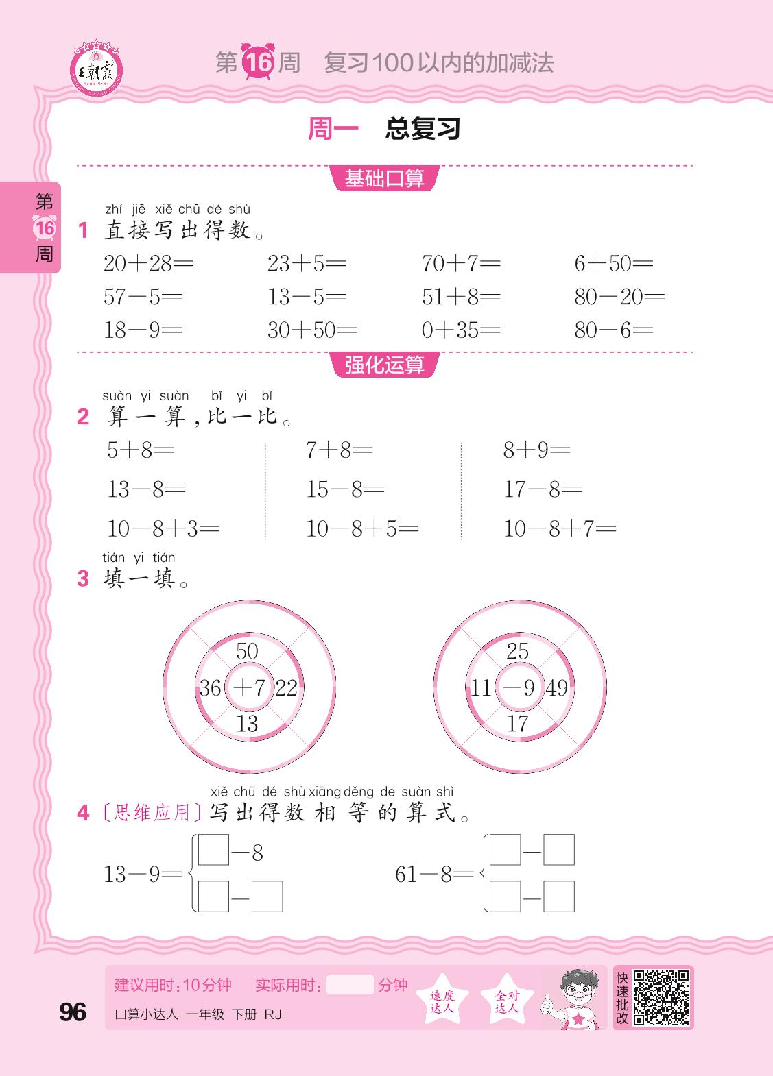 2024春下册一年级数学人教版 口算计算专练 第16周