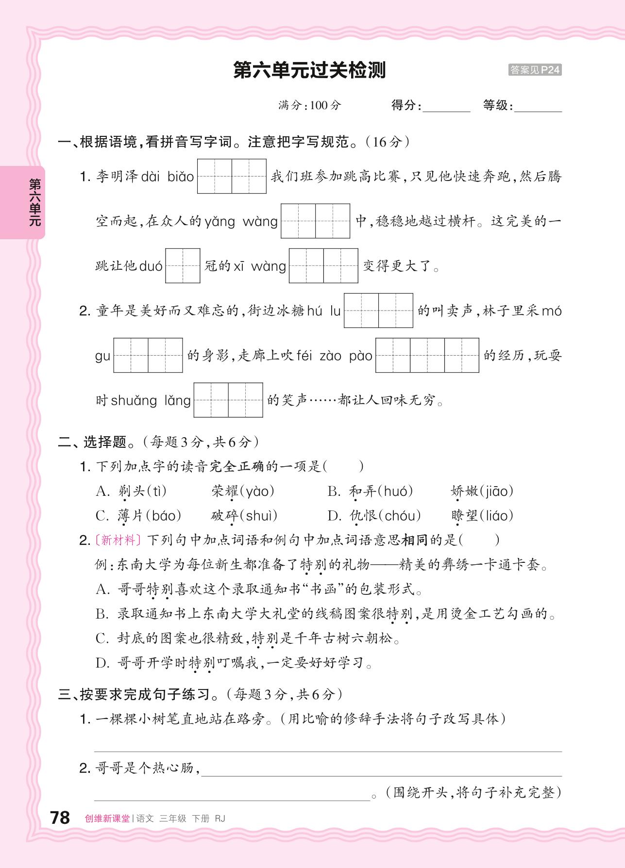 2024春下册三年级语文人教版 第六单元过关检测