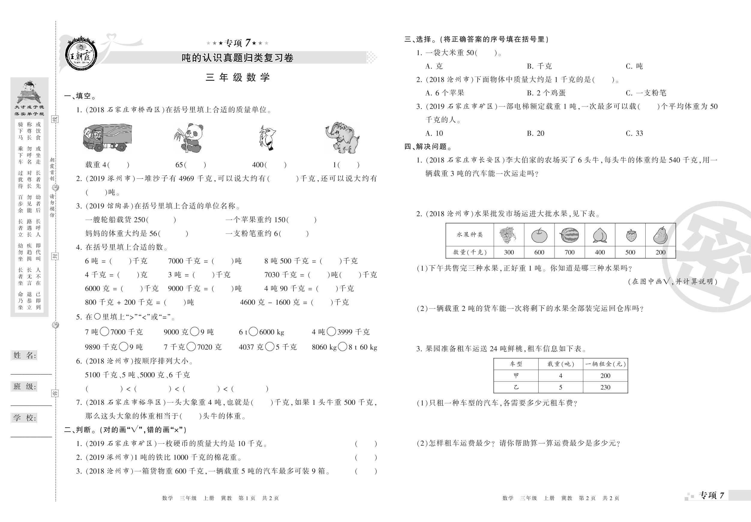 王朝霞期末专项卷——吨的认识、图形的运动及探索乐园真题归类复习三年级上册数学(冀教版)_R21080495530【0】