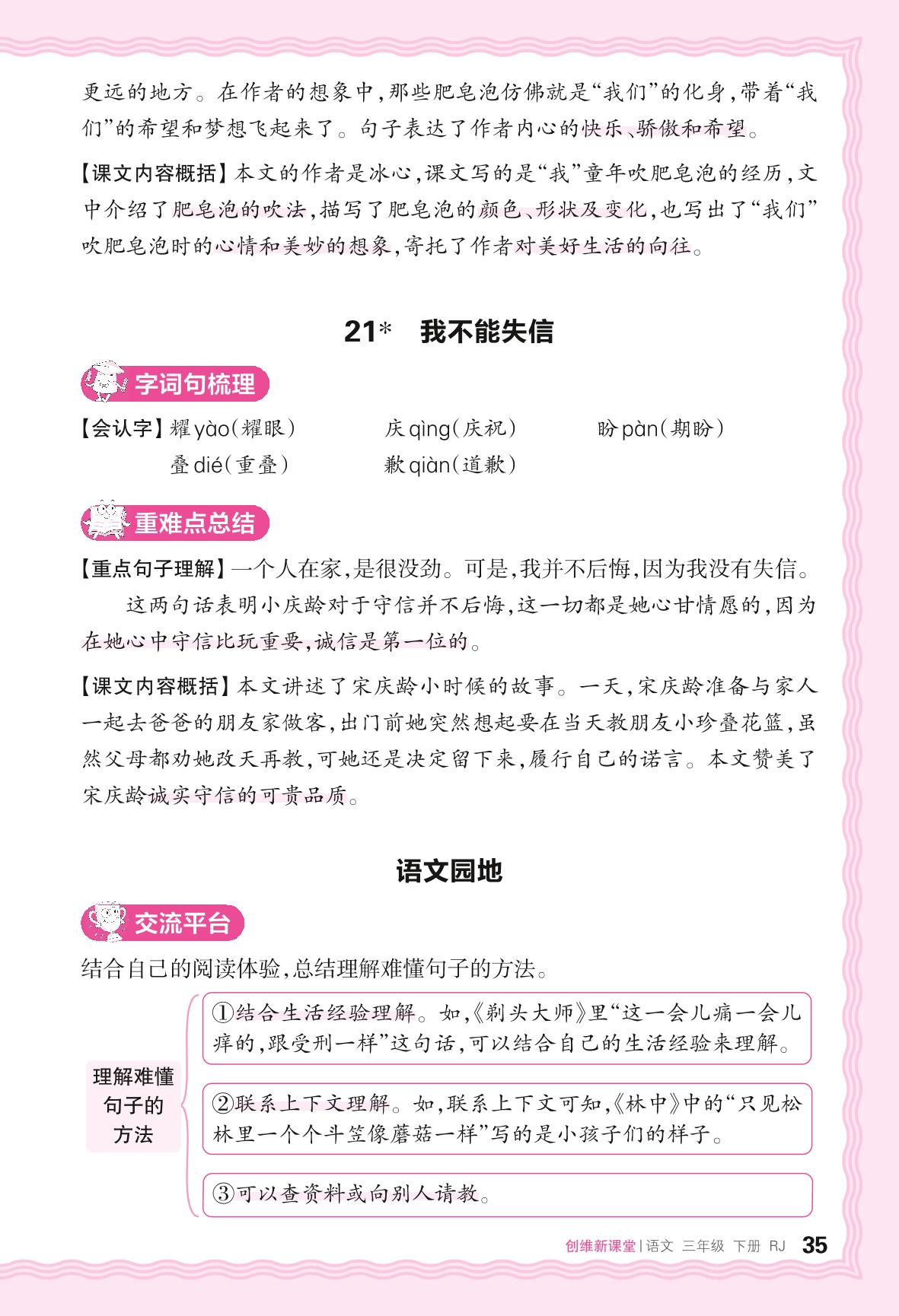 2024春下册三年级语文人教版 助学手册 第六单元——21. 我不能失信