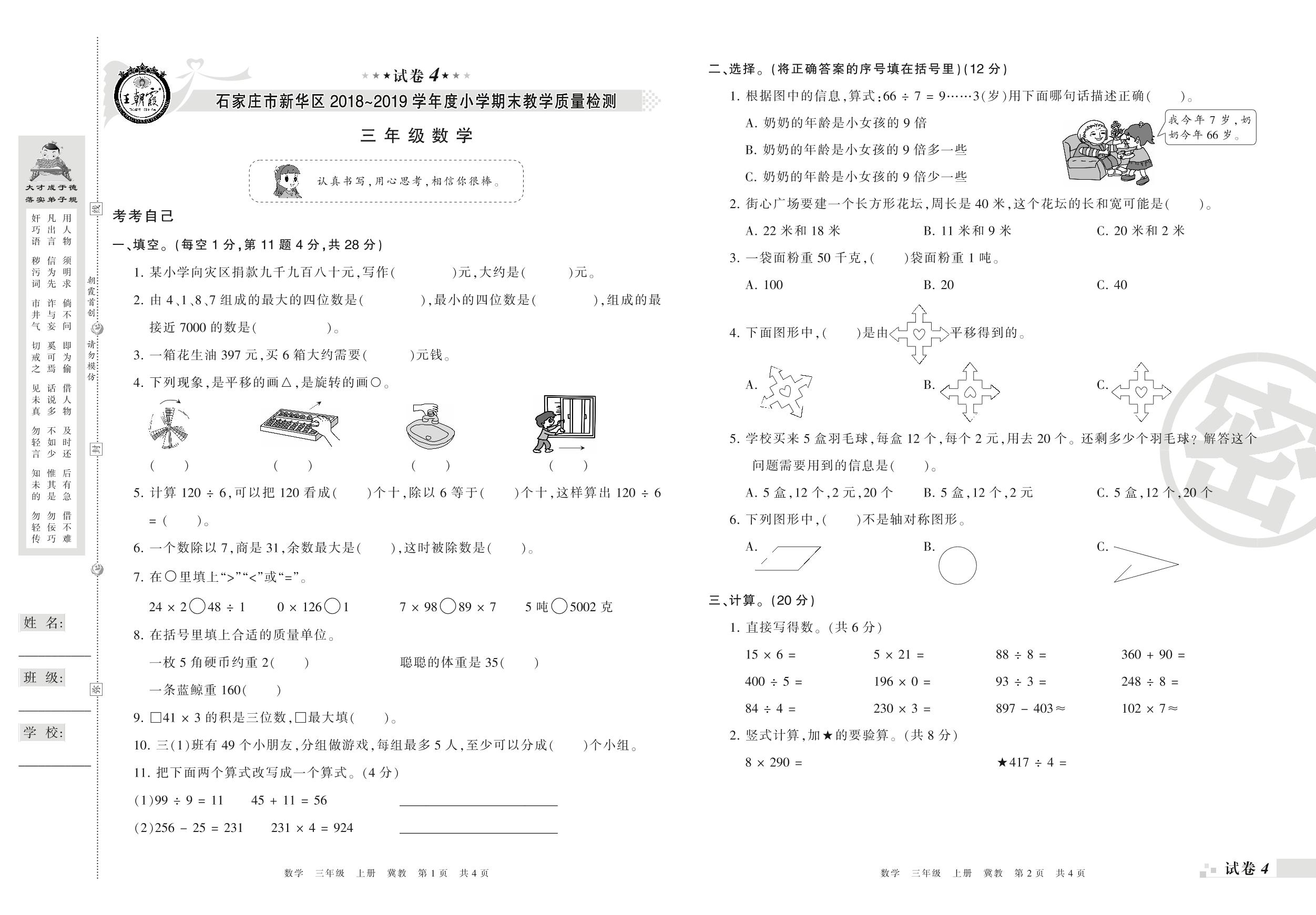 2018-2019学年第一学期石家庄市新华区三年级数学试卷(冀教版)【4】