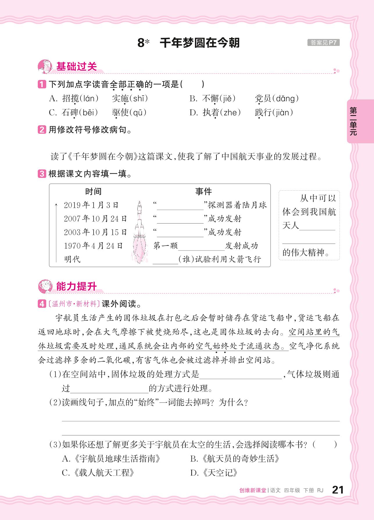2024春下册四年级语文人教版 第二单元 科普——8. 千年梦圆在今朝