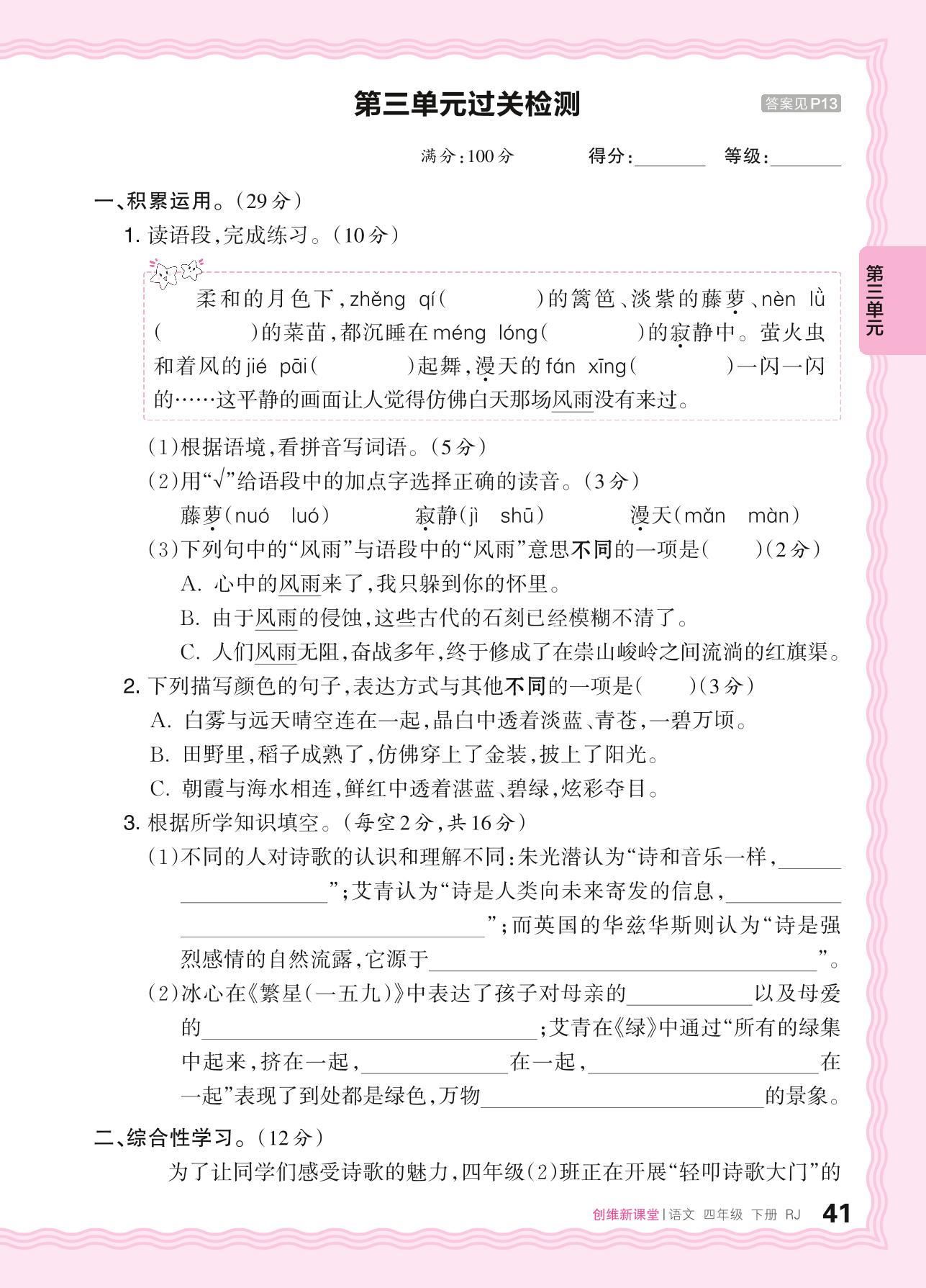 2024春下册四年级语文人教版 第三单元过关检测