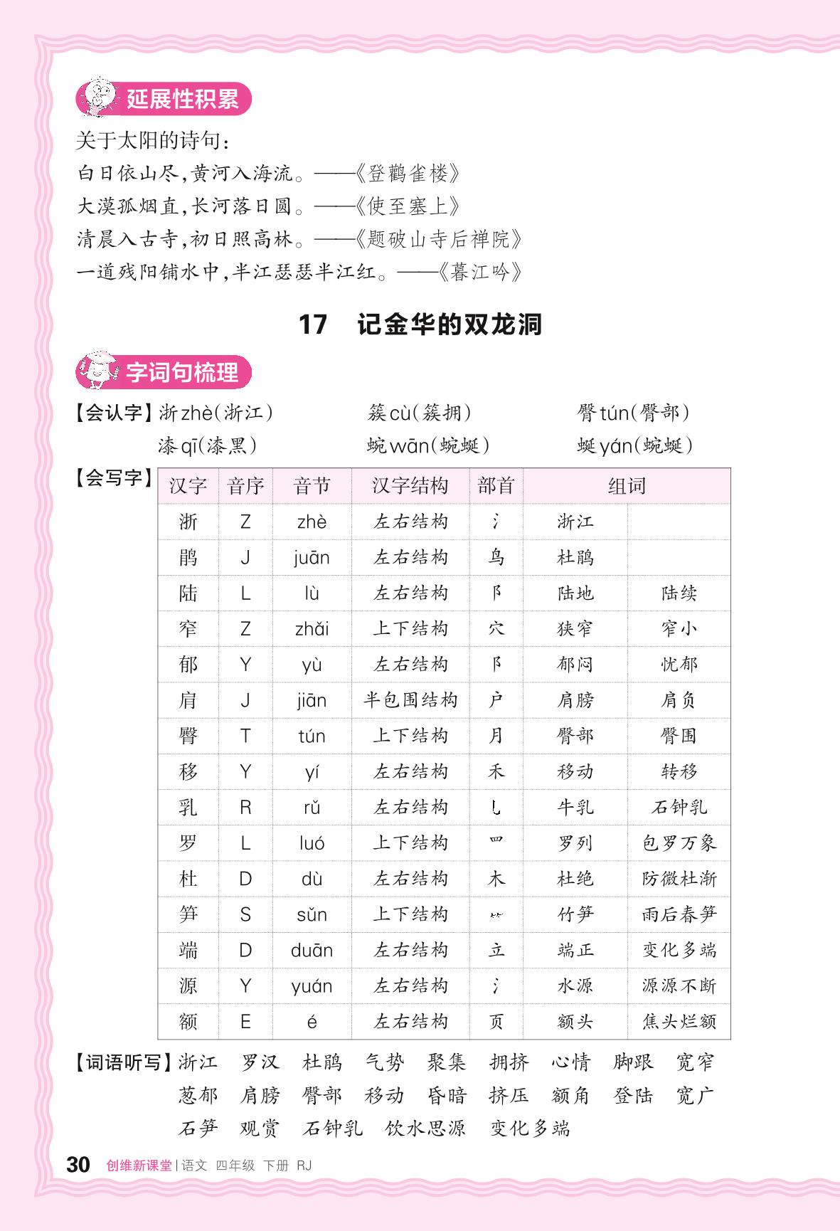 2024春下册四年级语文人教版 助学手册 第五单元——17. 记金华的双龙洞