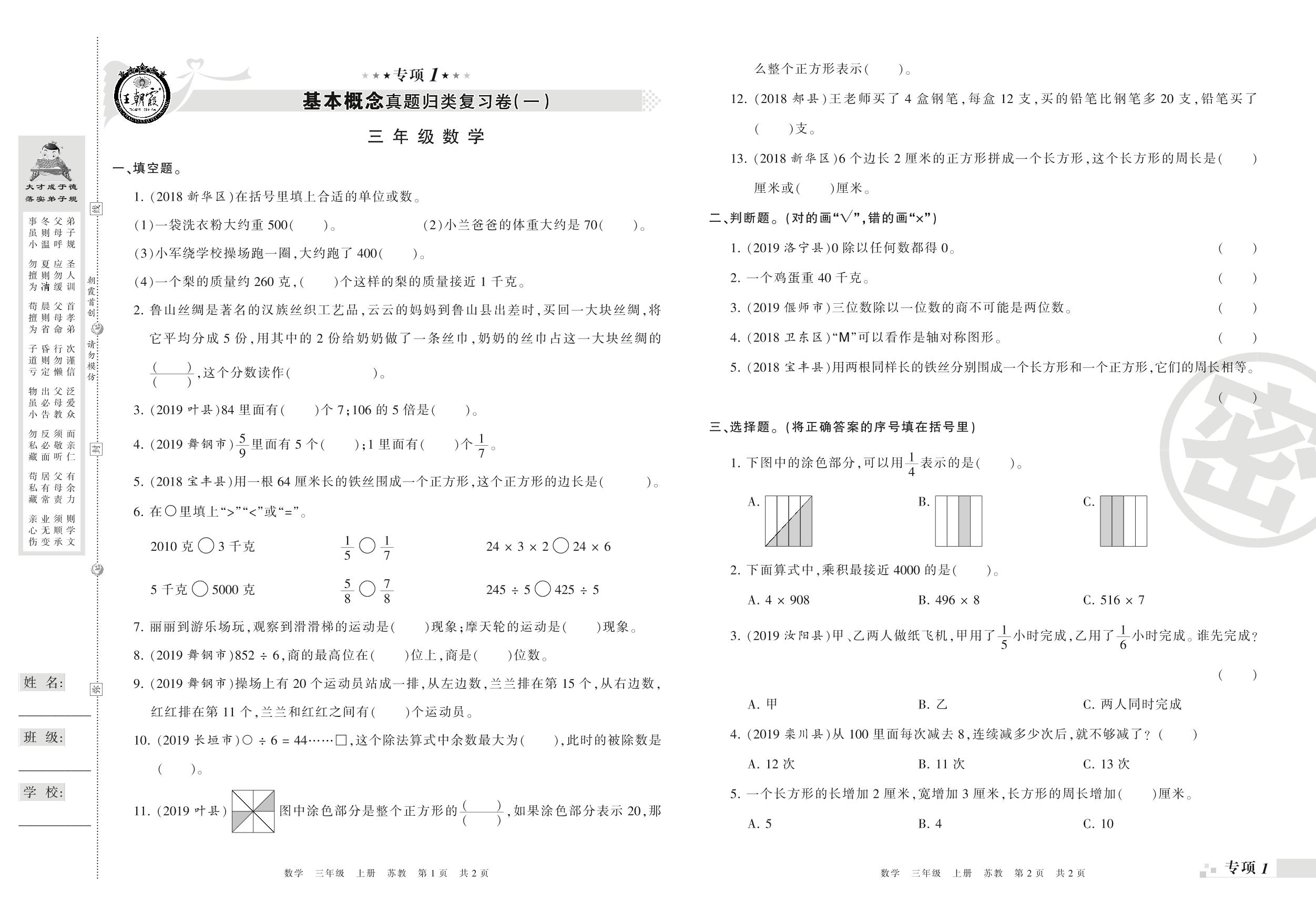 王朝霞期末专项卷——基本概念真题归类复习三年级上册数学(苏教版)_R21080495616【0】