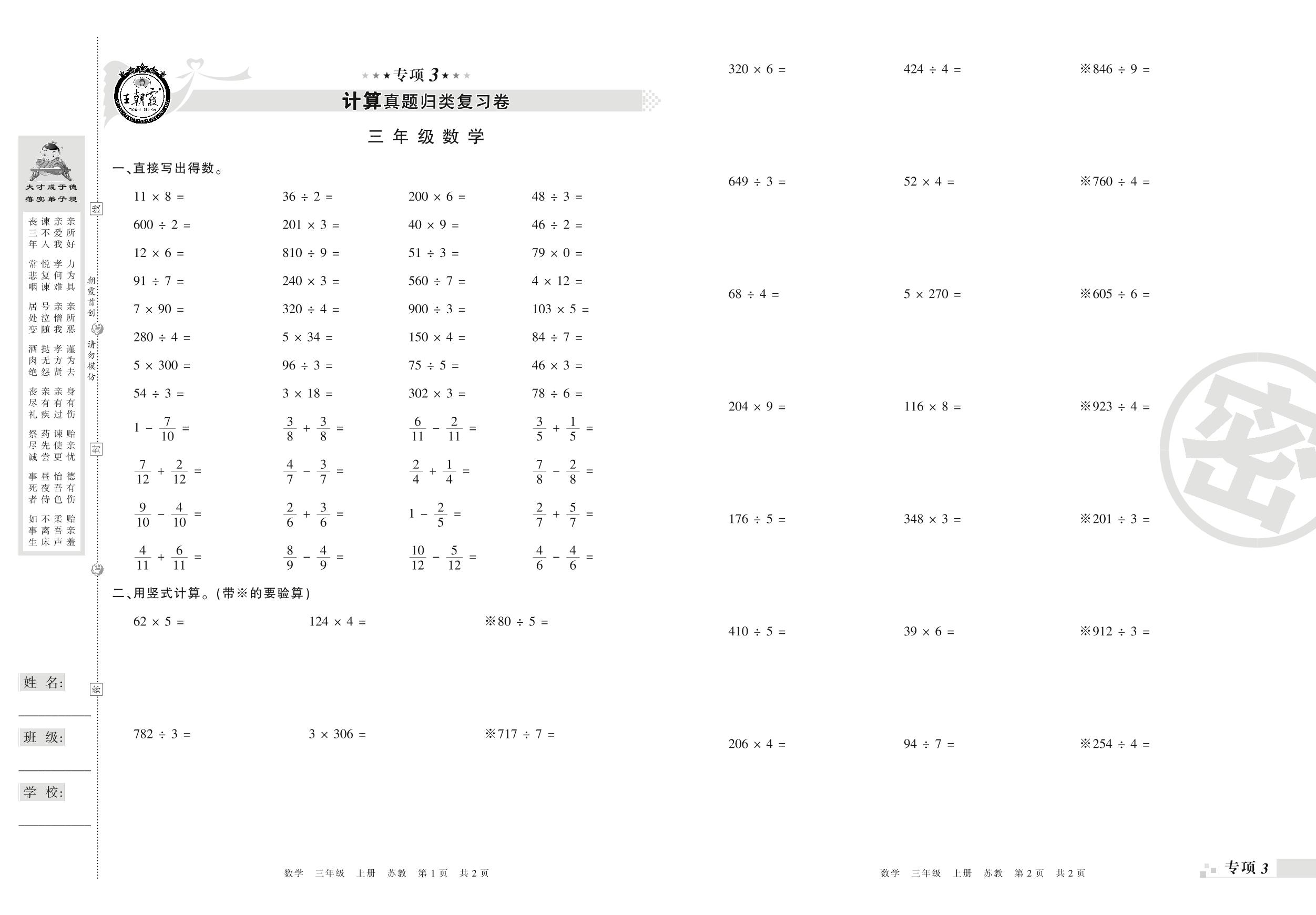 王朝霞期末专项卷——计算、解决问题真题归类复习三年级上册数学(苏教版)_R21080495618【0】