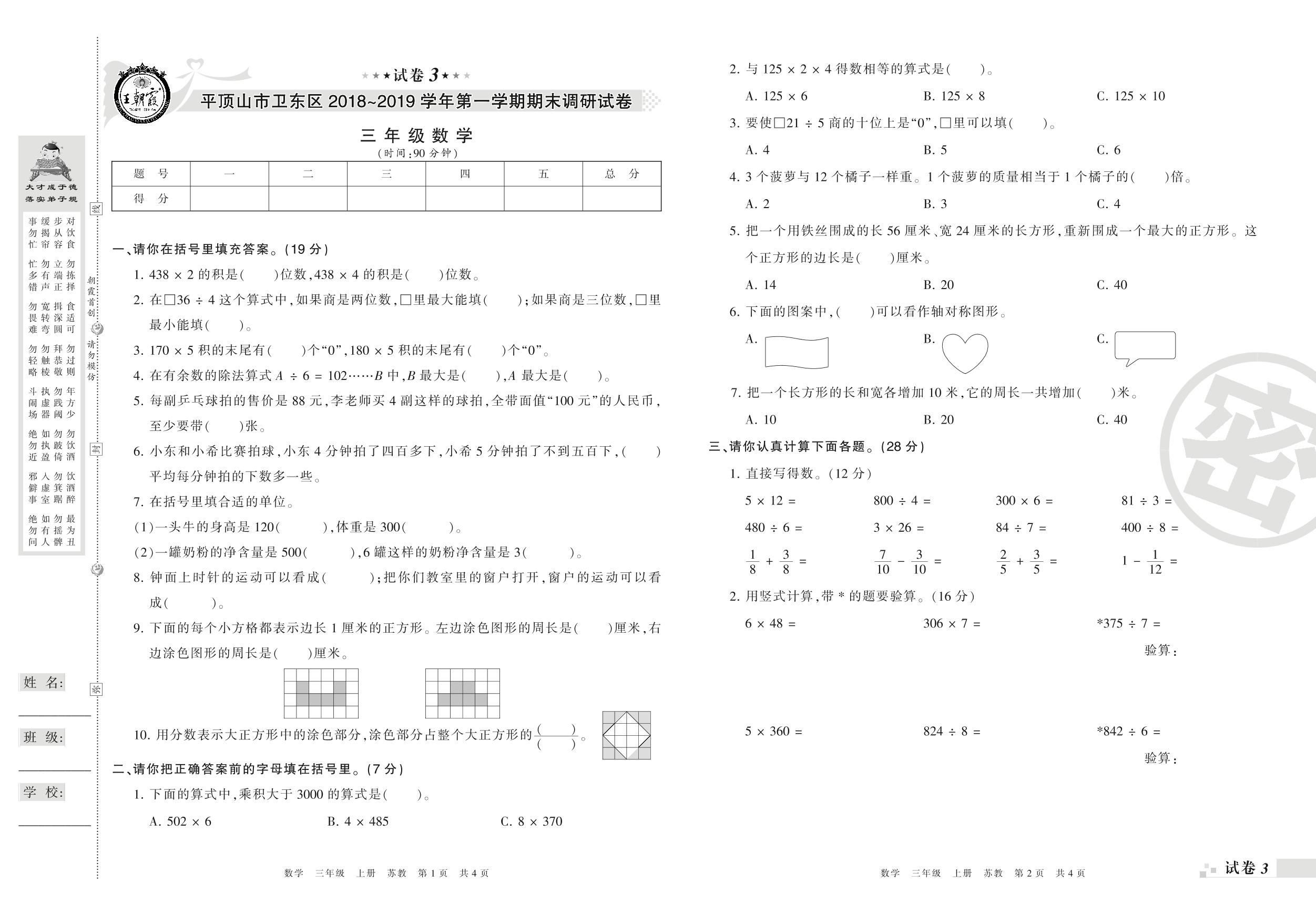 2018-2019学年第一学期平顶山市卫东区三年级数学试卷(苏教版)【3】