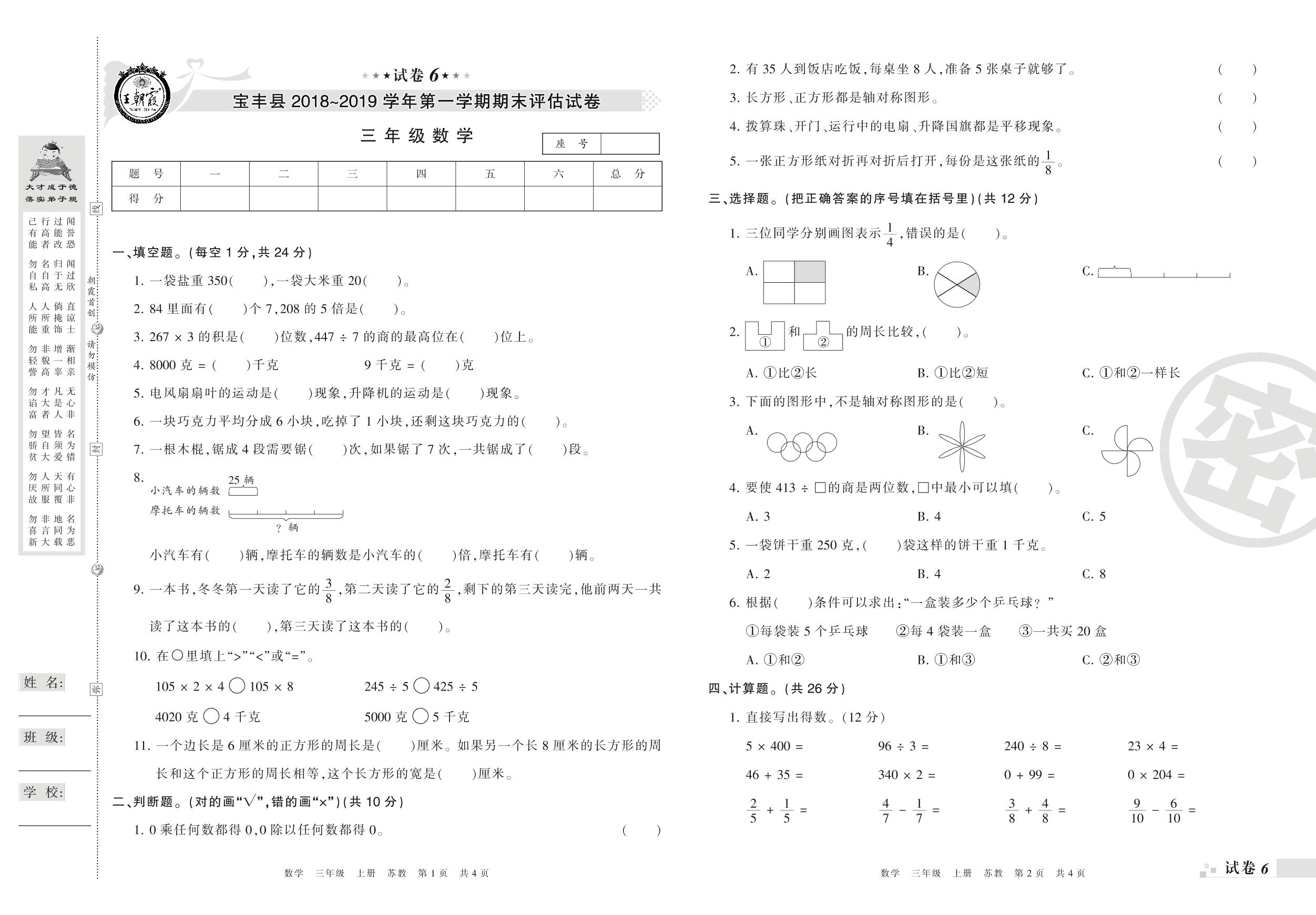 2018-2019学年第一学期平顶山市宝丰县三年级数学试卷(苏教版)【6】