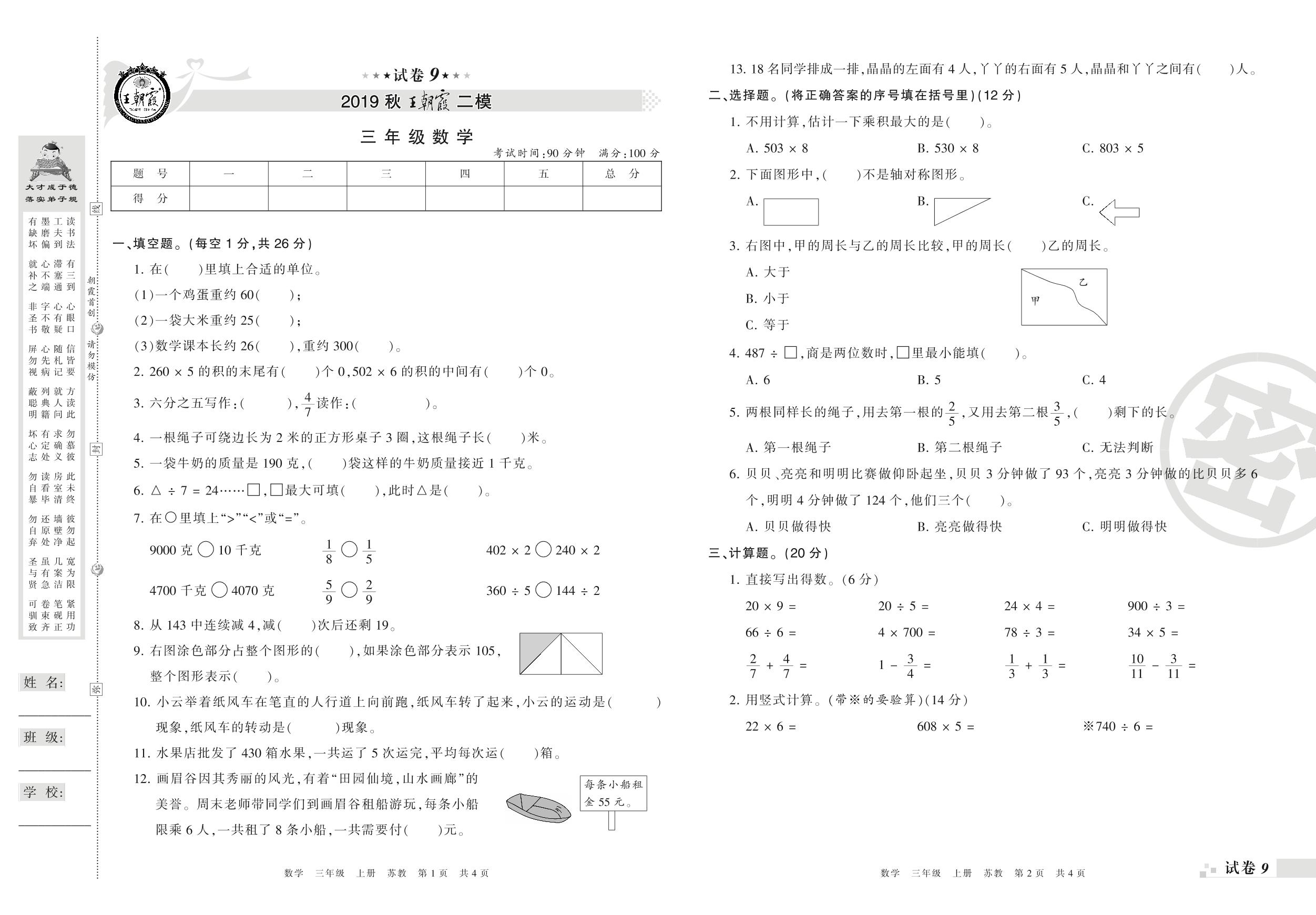 王朝霞期末模拟卷三年级上册数学(苏教版)_R21080495645【9】