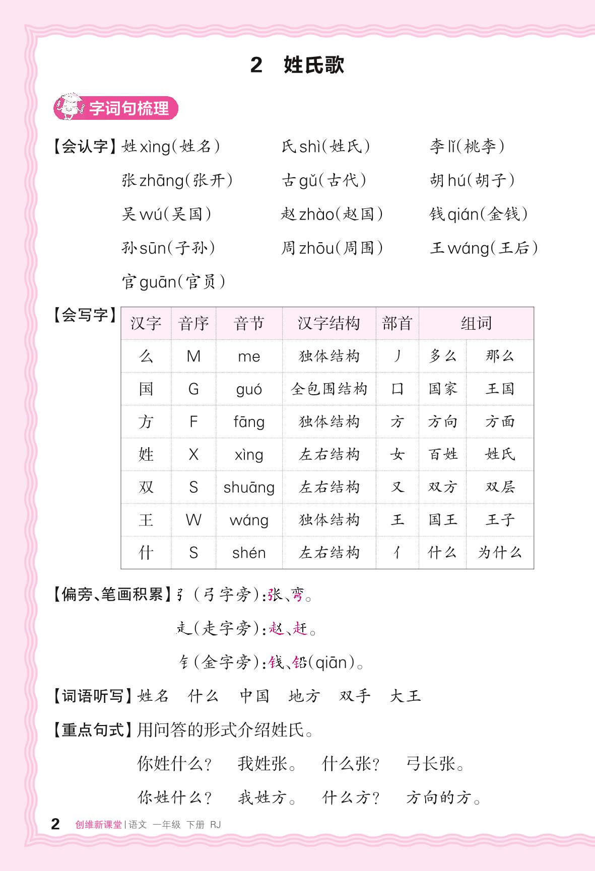 2024春下册一年级语文人教版 助学手册 第一单元——2. 姓氏歌