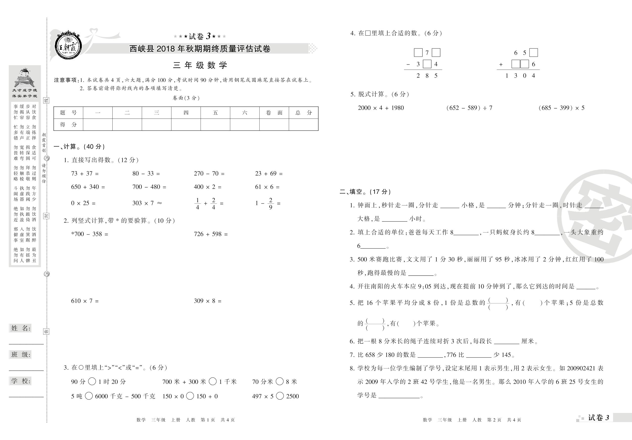 2018-2019学年第一学期南阳市西峡县三年级数学试卷(人教版)【3】