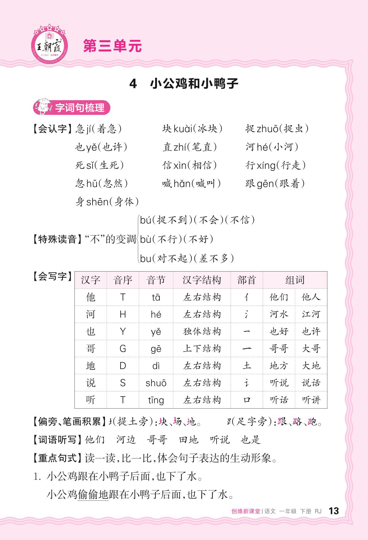 2024春下册一年级语文人教版 助学手册 第三单元——4. 小公鸡和小鸭子