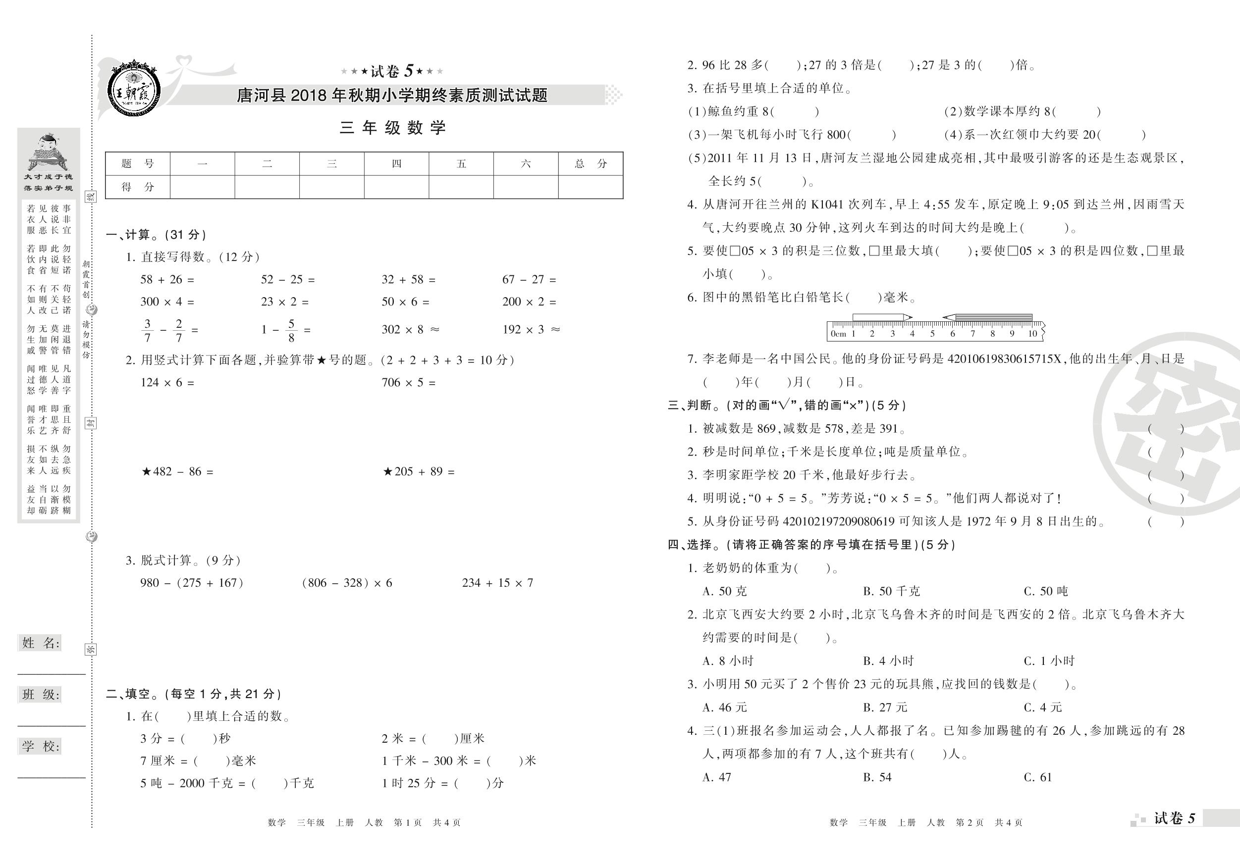 2018-2019学年第一学期南阳市唐河县三年级数学试卷(人教版)【5】