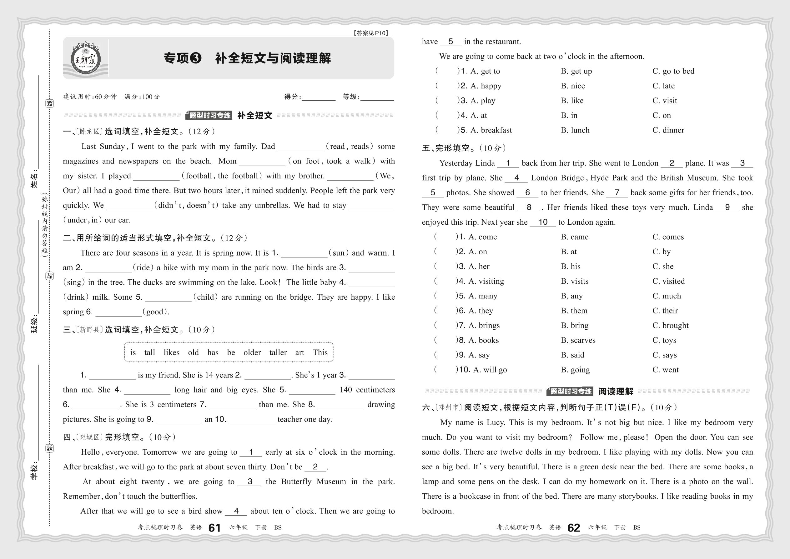 2024春下册六年级英语北师版 期末专项卷KD版·补全短文与阅读理解【3】