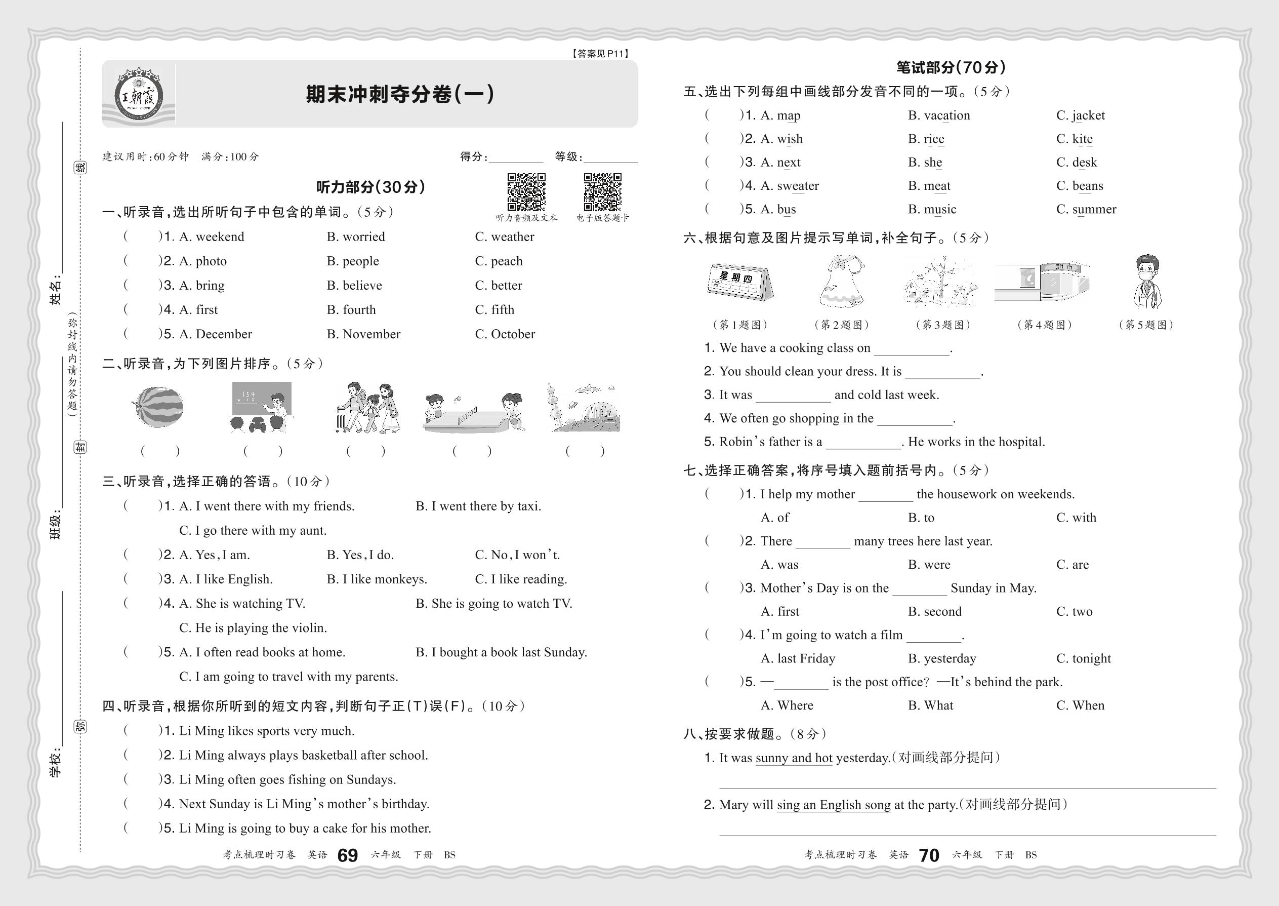 2024春下册六年级英语北师版 期末冲刺夺分卷(一)