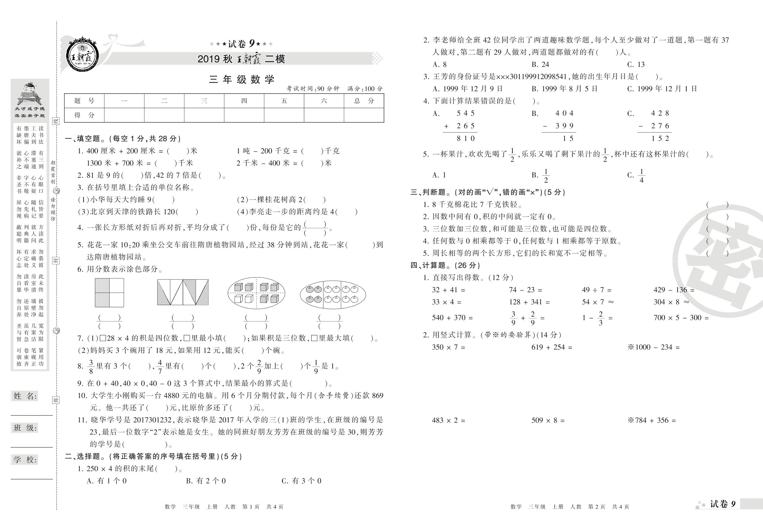 王朝霞期末模拟卷三年级上册数学(人教版)_R21080495731【9】