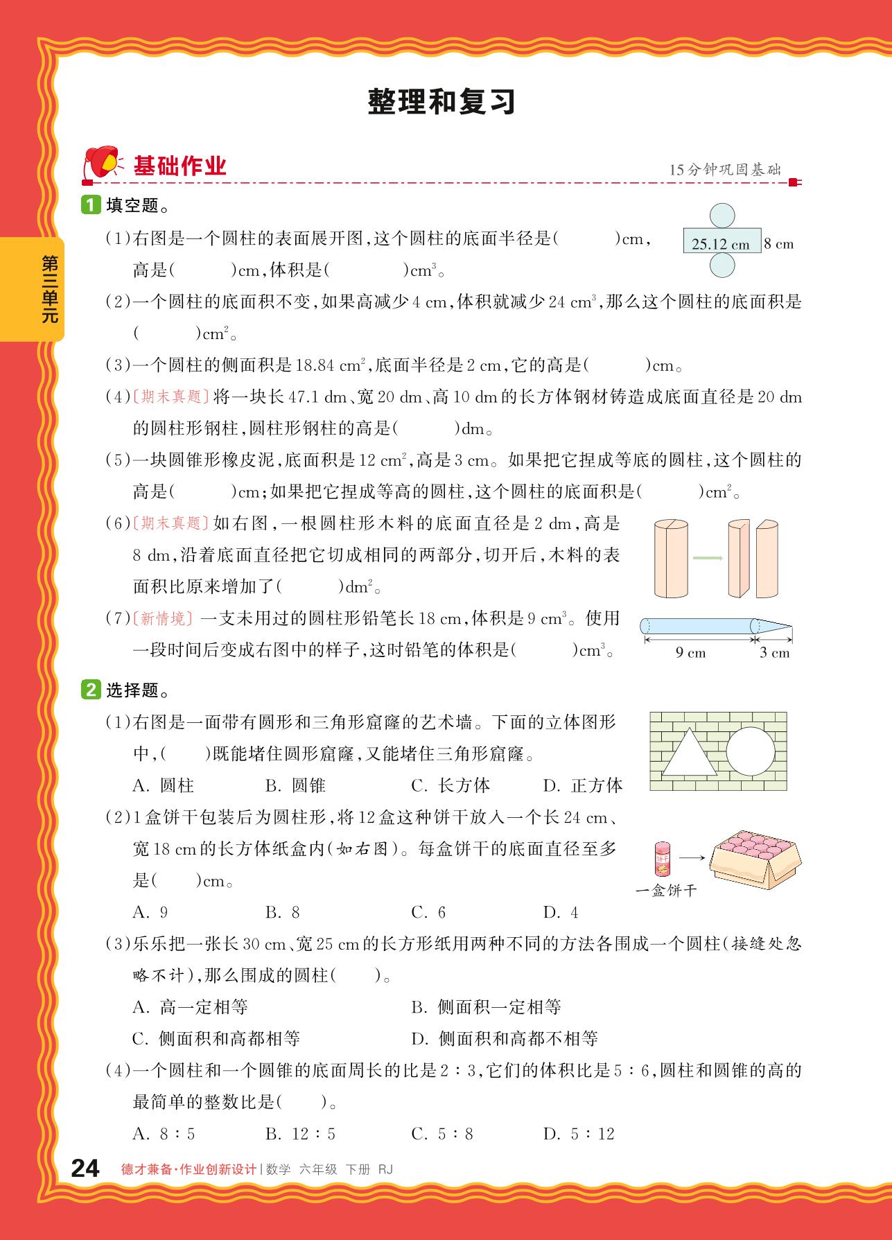 2024春下册六年级数学人教版 第三单元 圆柱与圆锥——整理和复习