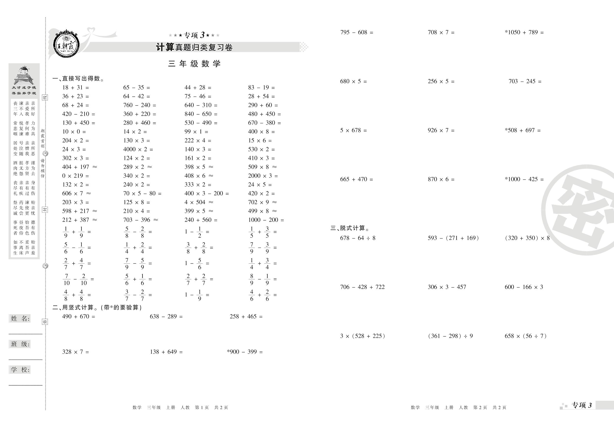 王朝霞期末专项卷——计算、解决问题真题归类复习三年级上册数学(人教版)_R21080495746【0】