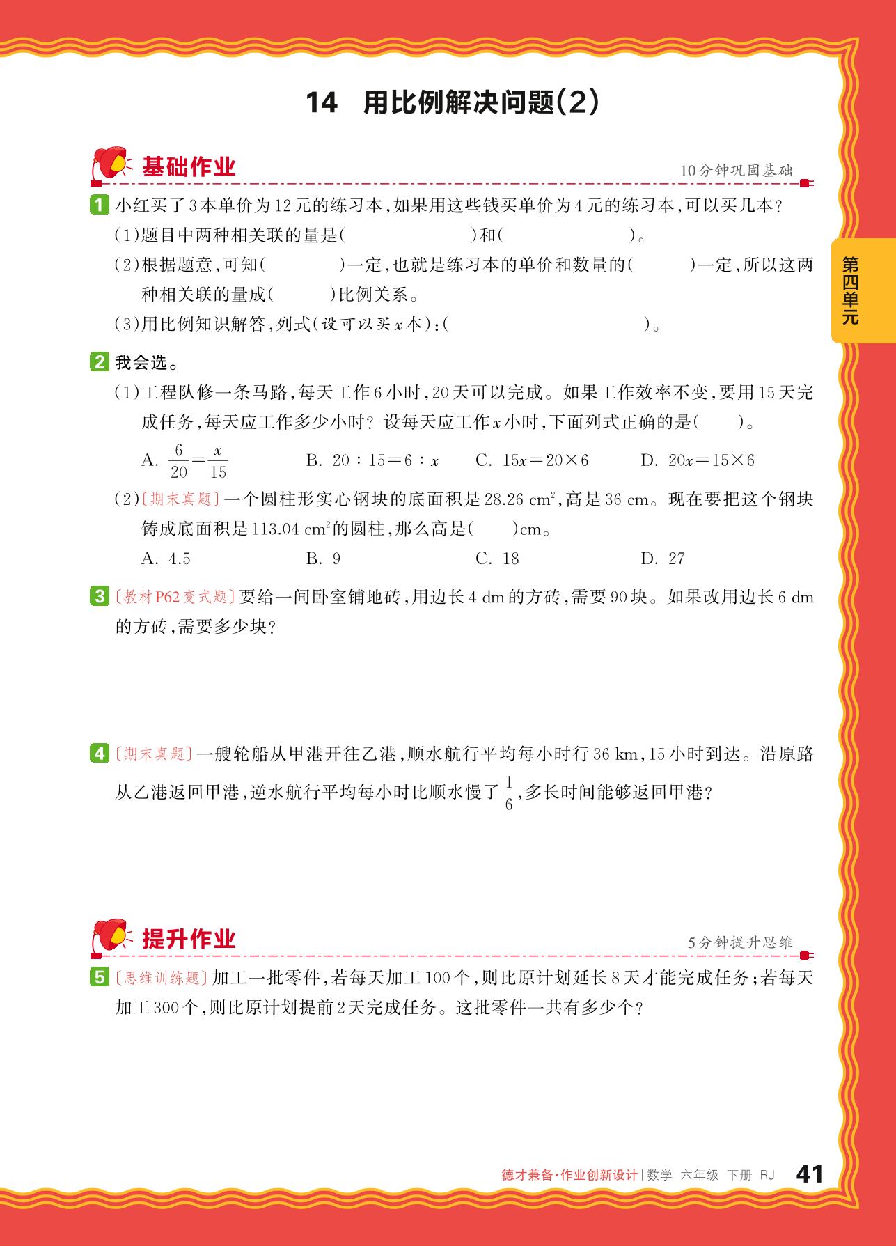 2024春下册六年级数学人教版 第四单元 比例——14. 用比例解决问题(2)