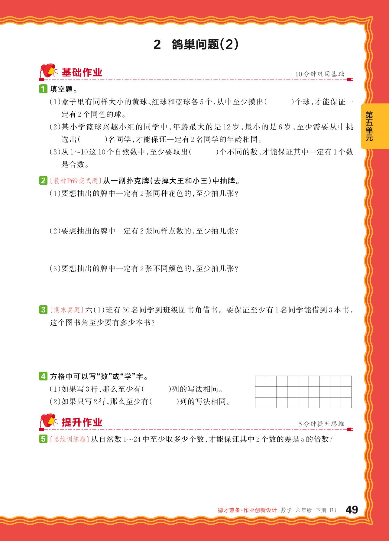 2024春下册六年级数学人教版 第五单元 数学广角 鸽巢问题——2. 鸽巢问题(2)