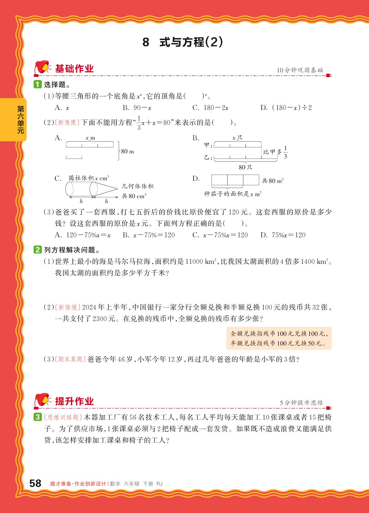 2024春下册六年级数学人教版 第六单元 整理和复习(数与代数)——8. 式与方程(2)