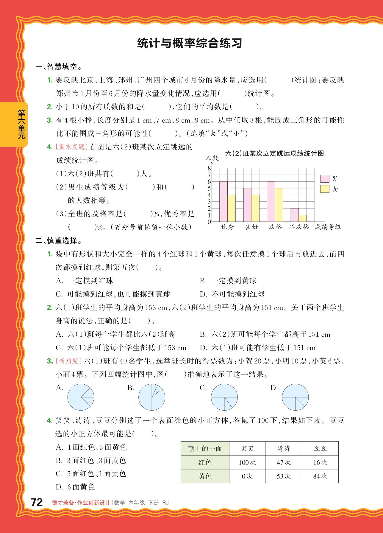 2024春下册六年级数学人教版 第六单元 整理和复习(统计与概率)——统计与概率综合练习