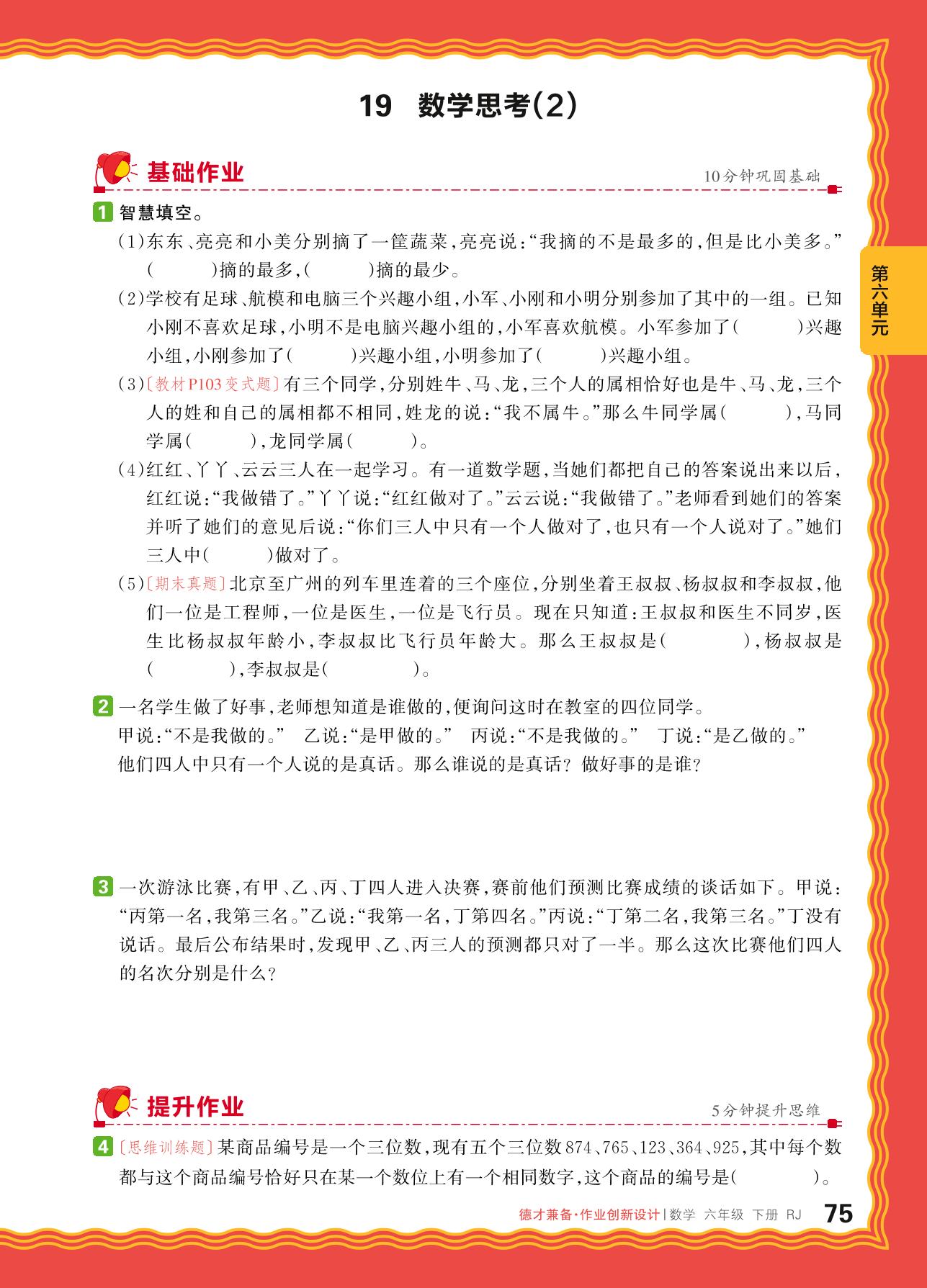 2024春下册六年级数学人教版 第六单元 整理和复习(数学思考)——19. 数学思考(2)
