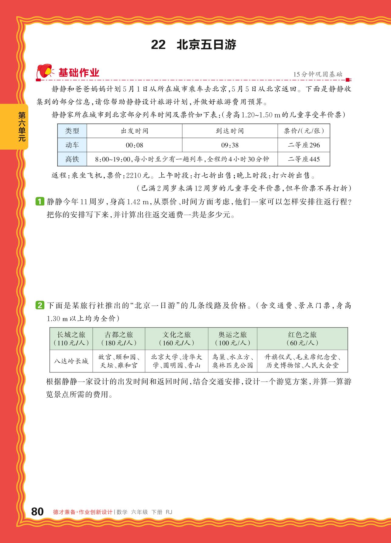 2024春下册六年级数学人教版 第六单元 整理和复习(综合与实践)——22. 北京五日游