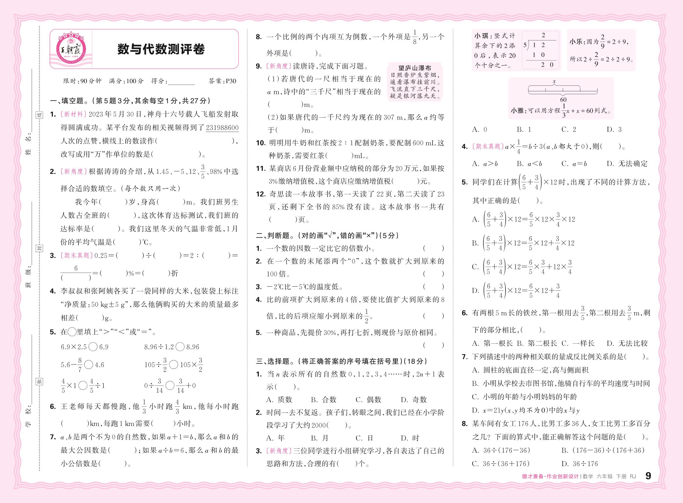 2024春下册六年级数学人教版 数与代数测评卷
