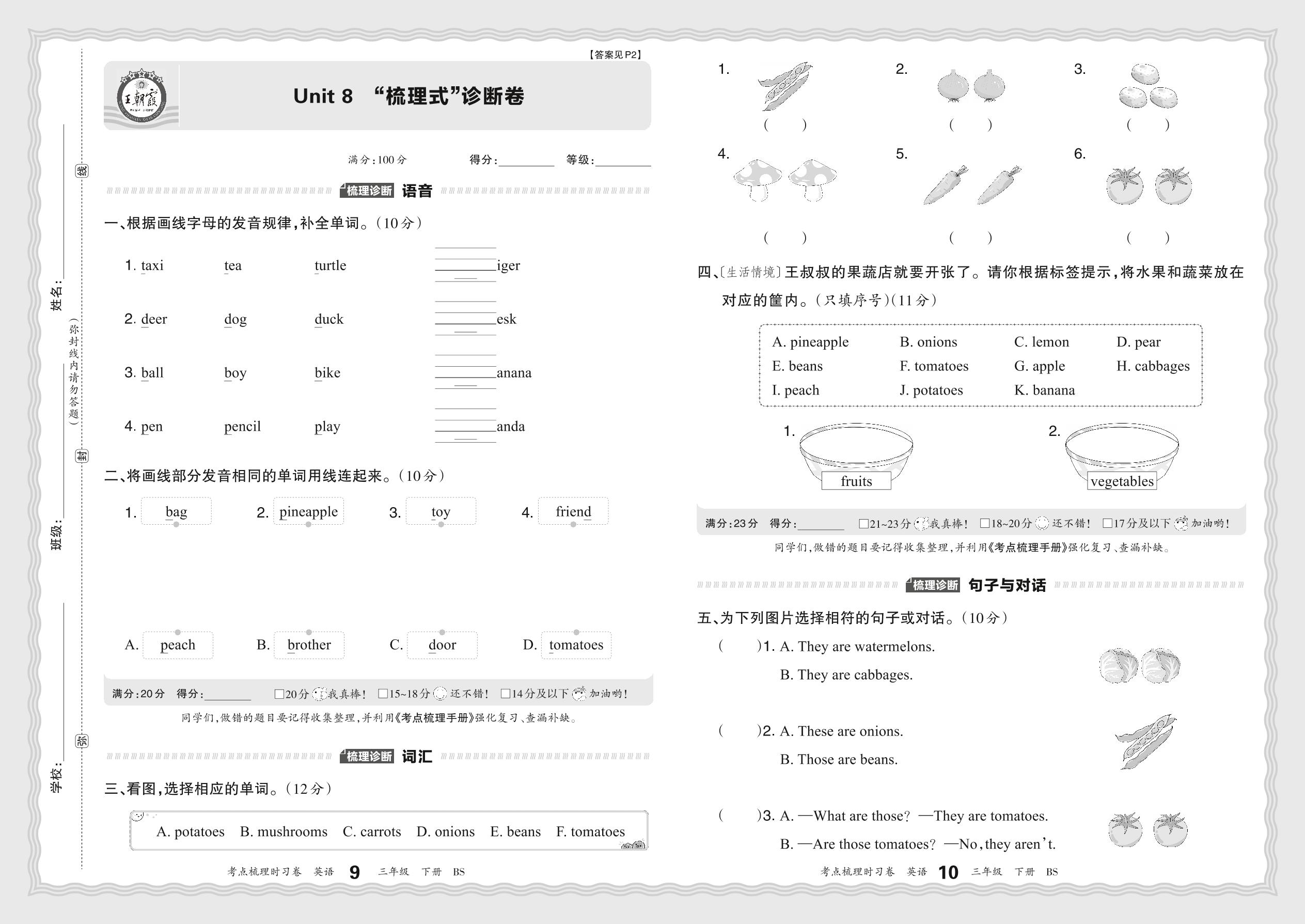 2024春下册三年级英语北师版 Unit 8 “梳理式”诊断卷